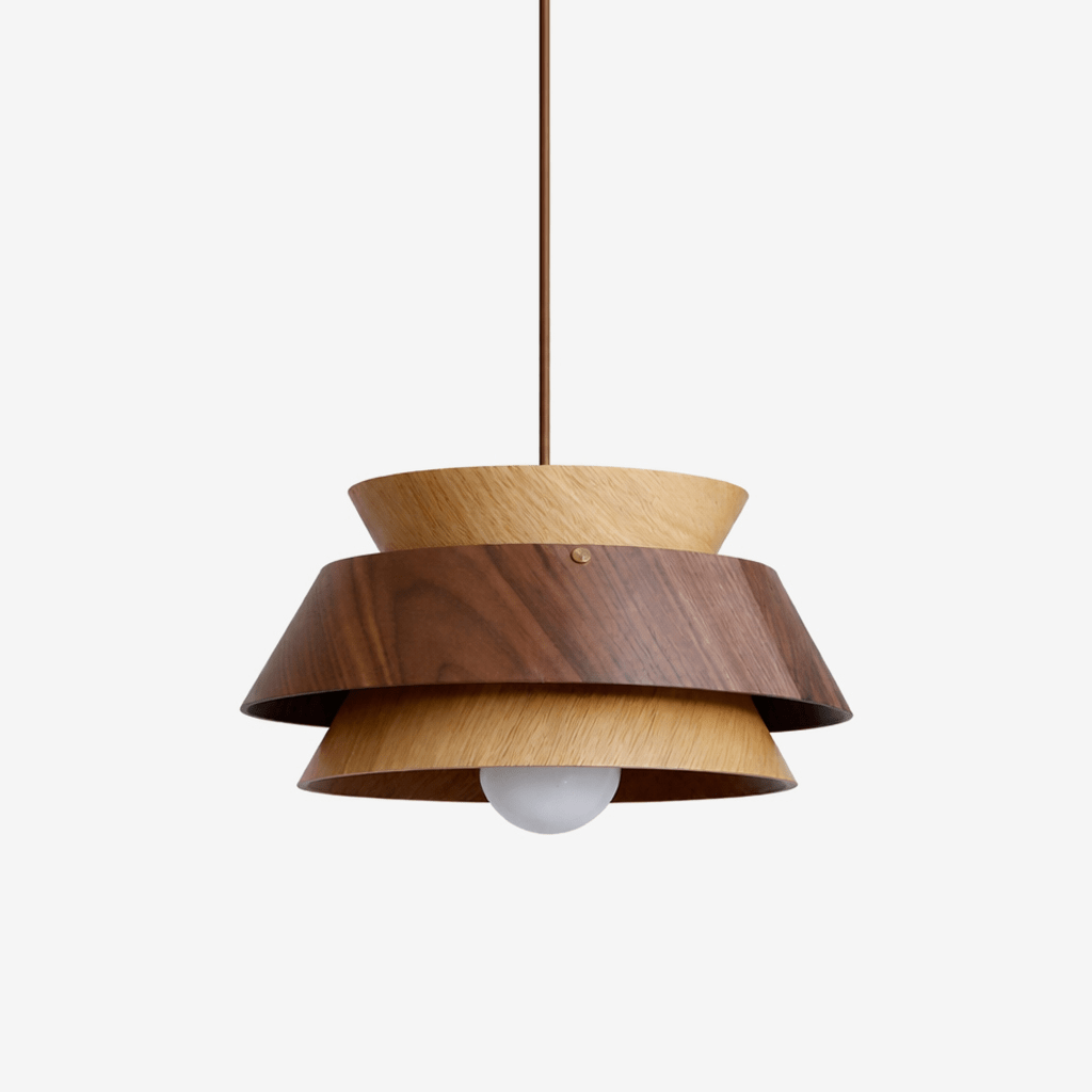 A distinctive pendant light featuring layered wooden shades in contrasting tones, creating a sculptural stacked silhouette. The overlapping wood rings highlight the natural grain while softly directing light downward through the center globe. The balanced mix of light and dark wood adds depth and modern character. Designed by Vakkerlight, this pendant brings warm natural texture and contemporary style to dining rooms, kitchen islands, or cozy living spaces.