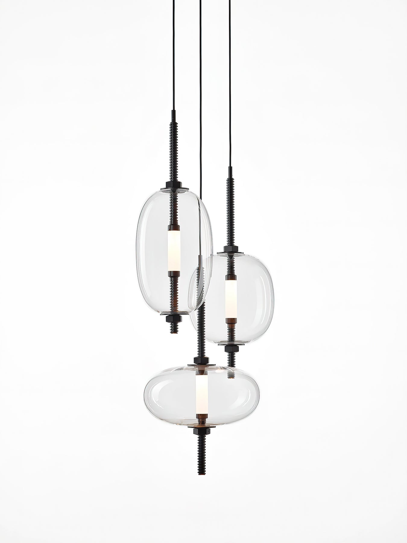 The fleeting moment when molten glass becomes a solid yet infinitely delicate object – such is the inspiration for Under Pressure, a bold new collection of lights that captures this transformation and the exciting tension it creates.‎ That singular, magical instance when hot molten glass succumbs to pressure and begins to assume its final form, an embodiment of strength and fragility in one.‎ The dynamic glass shapes appear still alive, evoking an image of organic deformation from external forces, an invisible pressure bending them to its will.‎ This striking visual effect is further accentuated with technical elements, such as a centre-line threaded rod that penetrates the delicate glass globe and brings a touch of geometric regularity and industrial elegance.‎