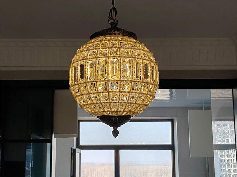 أضف لمسة رائعة إلى غرفة الطعام أو غرفة النوم أو المدخل الخاص بك مع هذه القلادة الرائعة ذات الإضاءة الواحدة. نحن نحب تعليق هذه القطعة بمفردها أو بشكل متعدد للحصول على مظهر أكثر دراماتيكية. إنه مصنوع من المعدن باللون الذهبي ويتميز بسلسلة قابلة للتعديل ورأس مزخرف مع نهاية سفلية مطابقة. يتميز غطاء الكرة الأرضية بتصميم قفص مغطى بصفوف من البلورات الشفافة التي تتلألأ في الضوء.