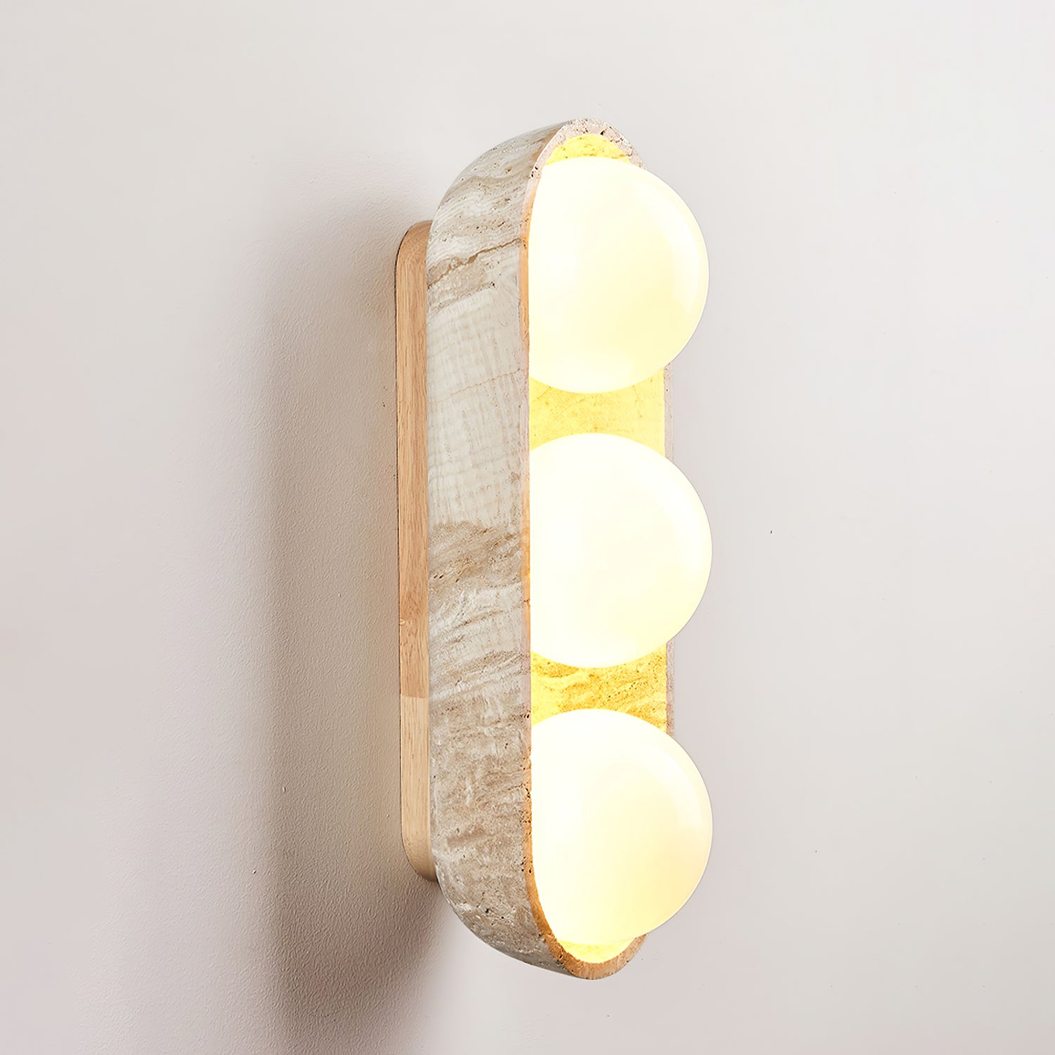 The Vakkerlight Solstice Trio Wall Sconce captures the harmony of natural elements and soft illumination in a striking, sculptural form. Featuring three glowing orbs cradled within a hand-carved stone shell and mounted on a warm wooden base, this design evokes the quiet rhythm of rising suns or lunar phases. The rounded contours and golden inner glow create an atmosphere of warmth and serenity — ideal for entryways, bedside walls, or ambient accent lighting. With its fusion of stone, wood, and light, Solstice Trio is a celebration of balance and elemental beauty — exclusively from Vakkerlight.
