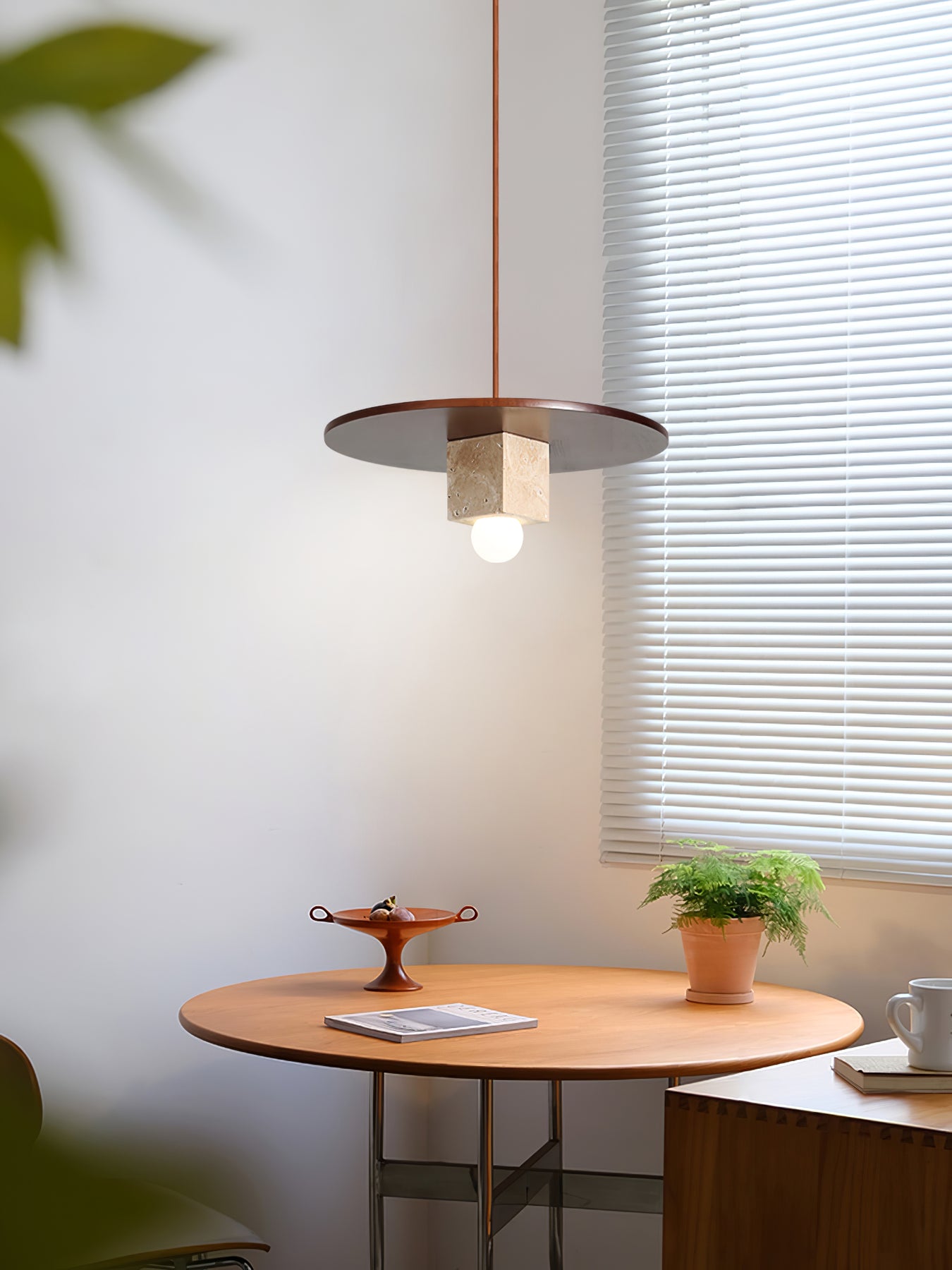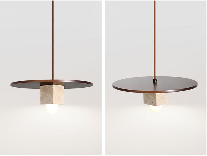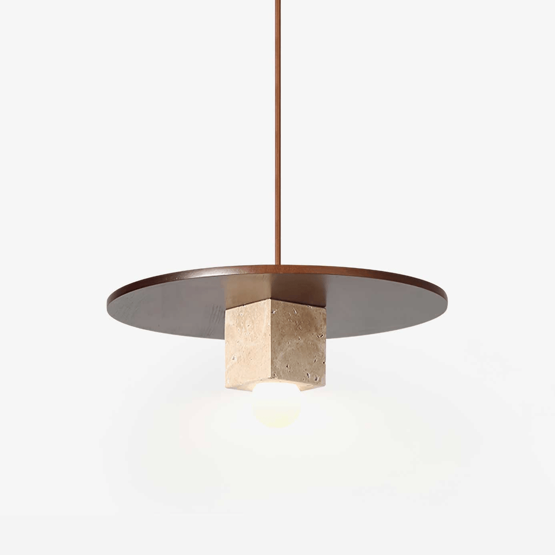 The Tondo Stone Disc Pendant Light by Vakkerlight pairs a refined circular silhouette with a raw travertine stone block to create a harmonious interplay of material and form. The rich wood-finish disc floats above a natural stone cube that houses a glowing orb, delivering warm illumination with sculptural impact. Ideal for dining areas, entryways, or modern interiors seeking subtle architectural character.