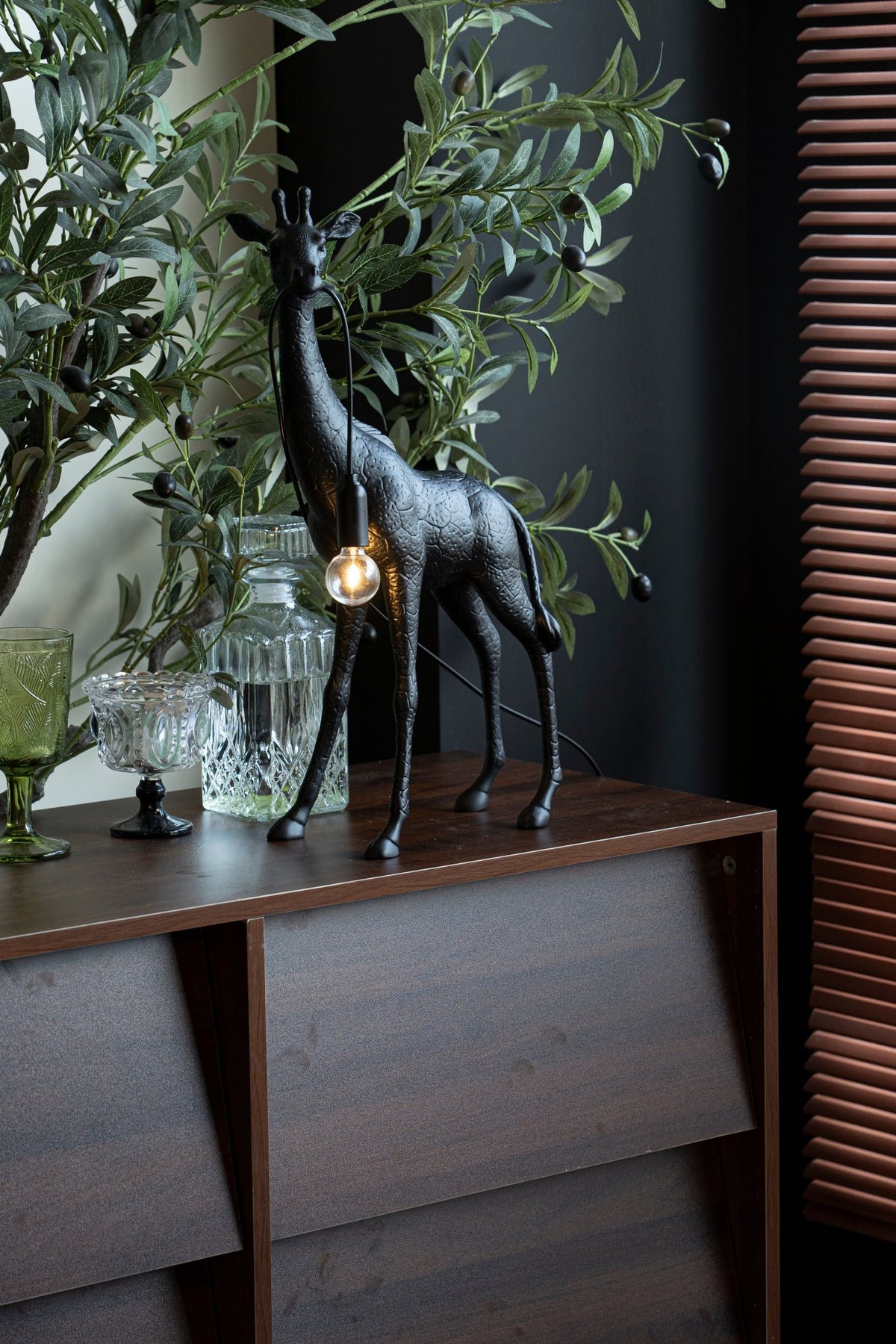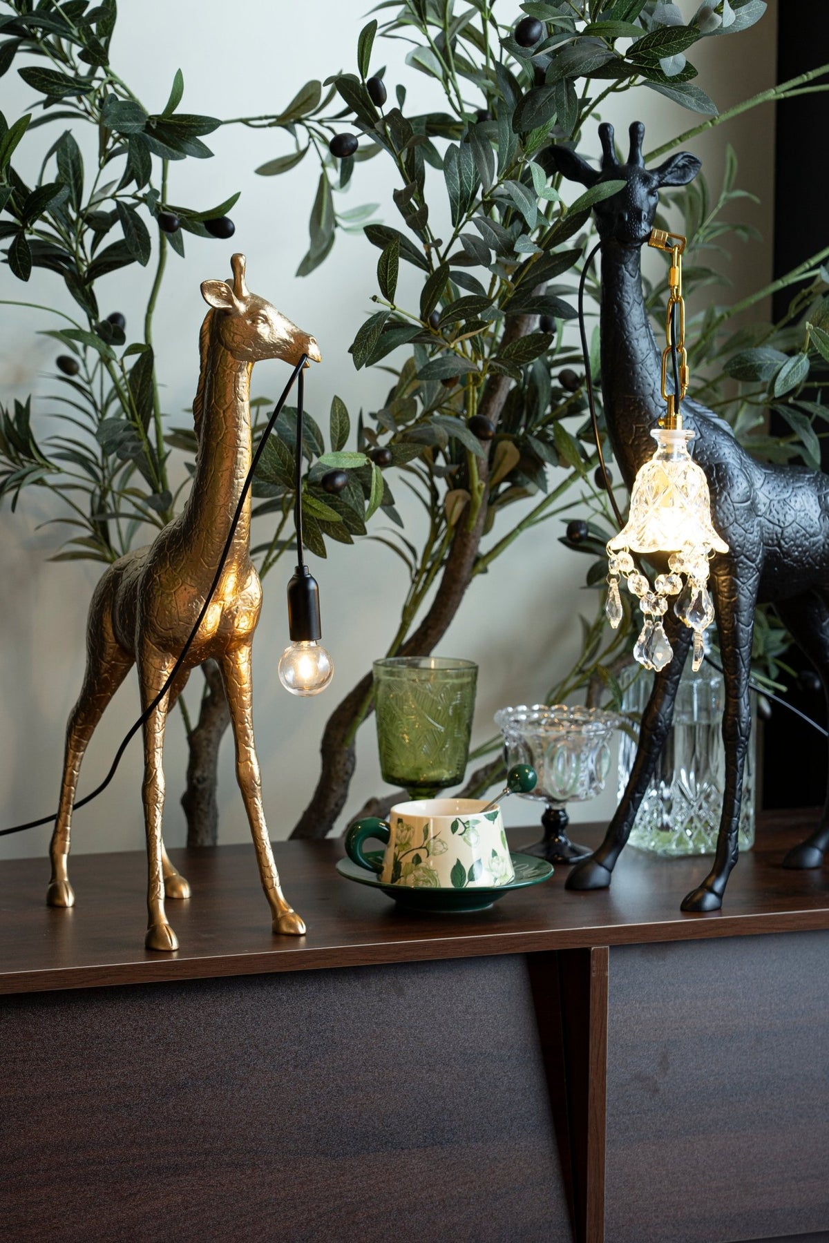 Sculpted in a matte black finish, the giraffe’s elegant silhouette holds a vintage-inspired crystal pendant, creating a warm, sparkling glow that feels both whimsical and sophisticated.
