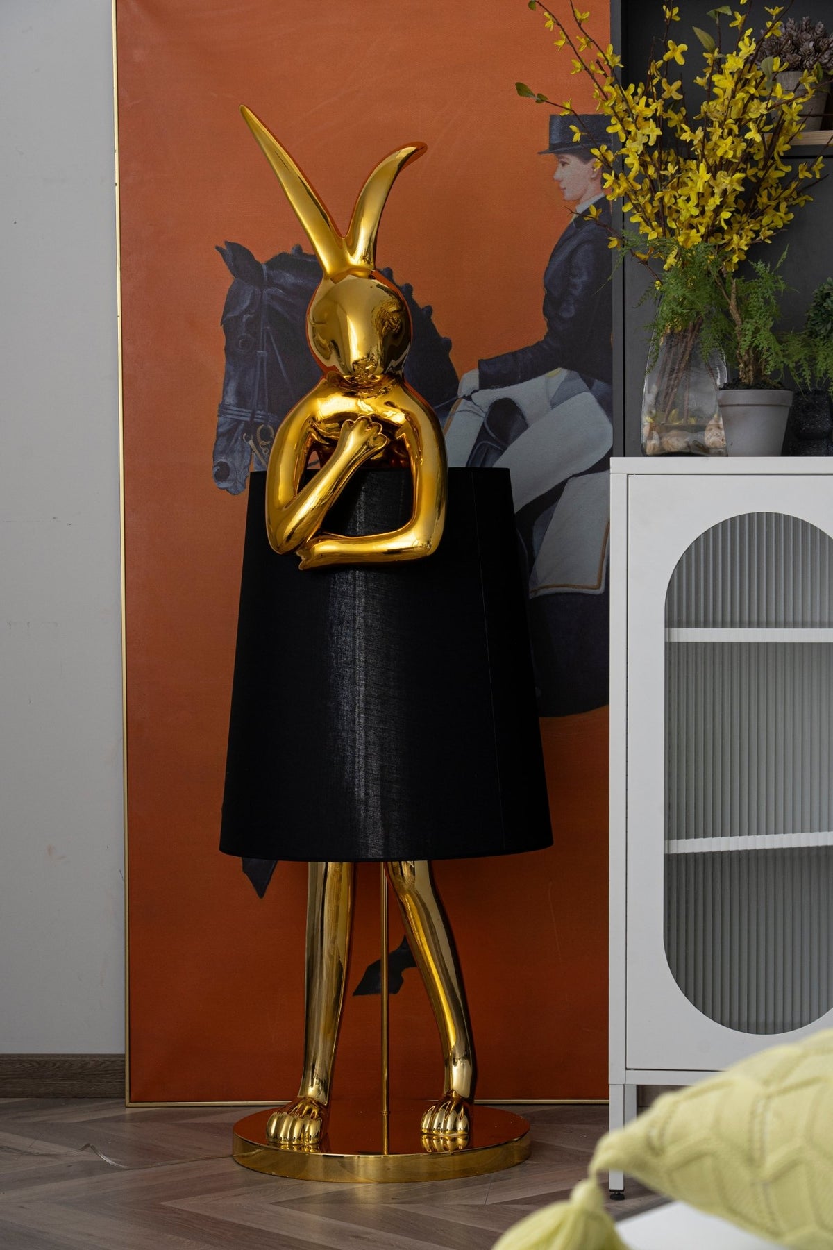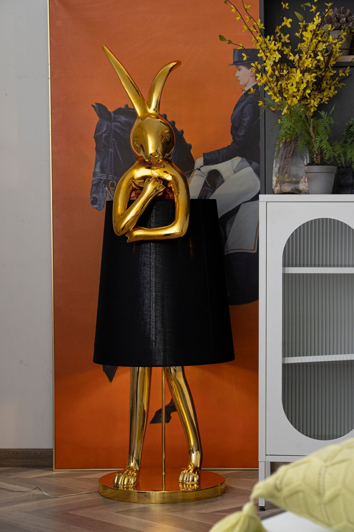 Crafted in a warm gilded finish, the long-eared hare stands with a relaxed, almost poetic posture—half-hidden behind a crisp white lampshade as if pausing mid-thought. The result is a charming yet refined accent piece that brings personality without feeling childish.