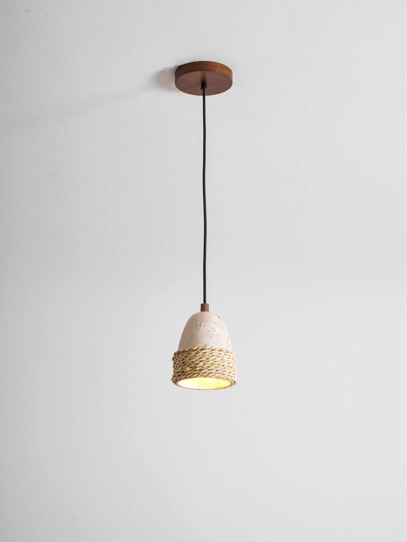 The Arbor Nest Pendant Lamp is a harmonious blend of rugged earth and coastal calm. Shaped like a softened dome, the shade is crafted from naturally textured travertine stone, exuding grounded elegance. Its base is wrapped in handwoven natural fiber, reminiscent of seagrass or rattan, adding a tactile warmth and artisanal character to the design. Topped with a subtle walnut wood detail, this pendant captures the balance between the raw and the refined. Ideal for bohemian, Mediterranean, or Japandi-inspired interiors, the Arbor Nest Pendant brings a cozy, organic touch to dining spaces, reading nooks, or restful retreats.