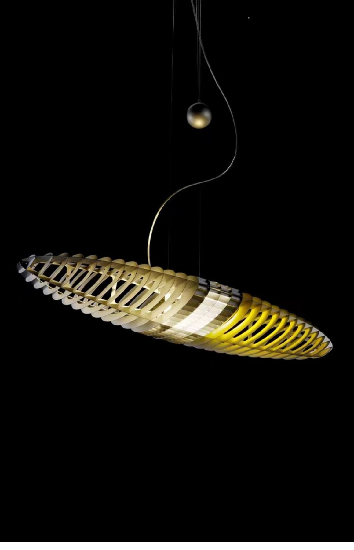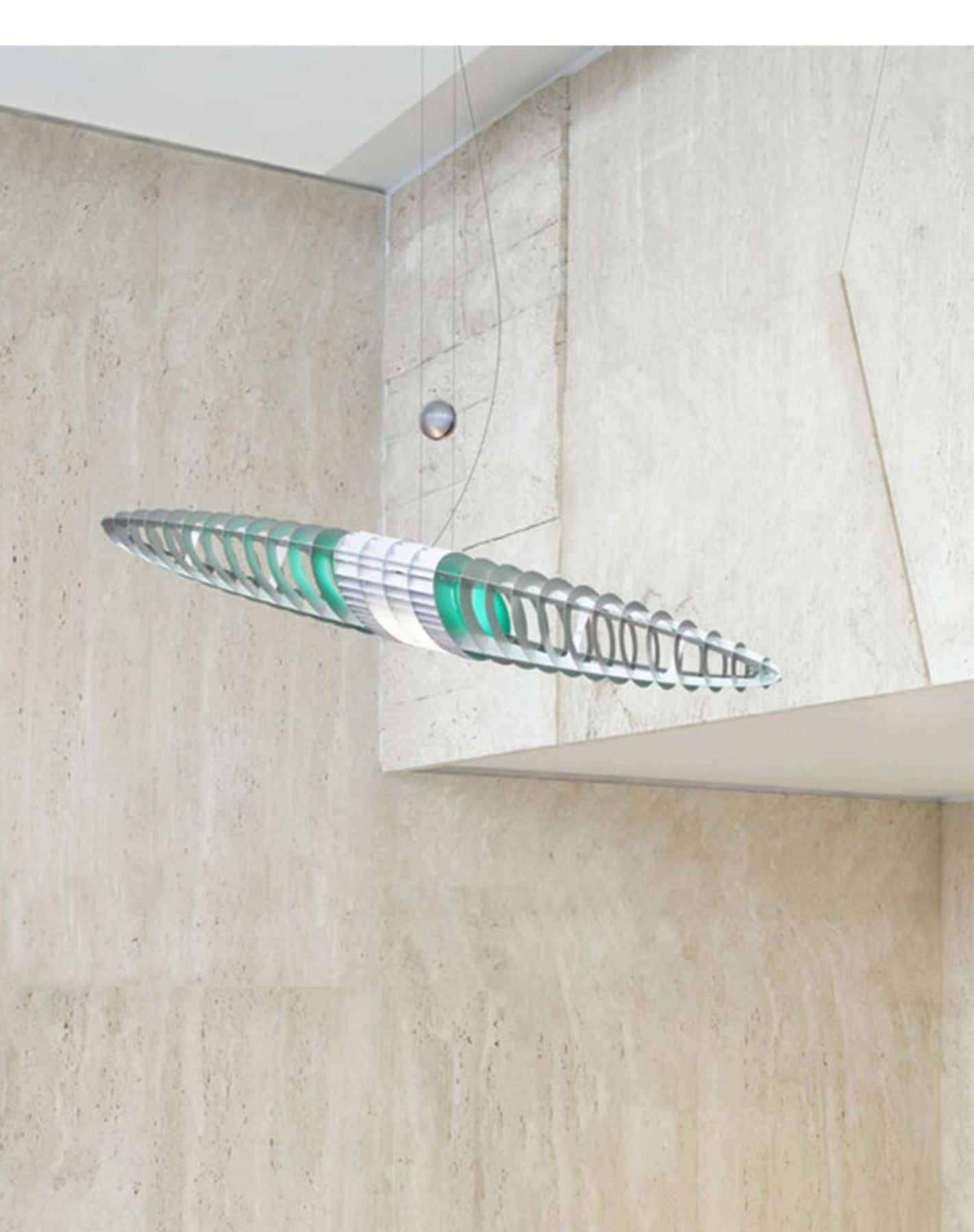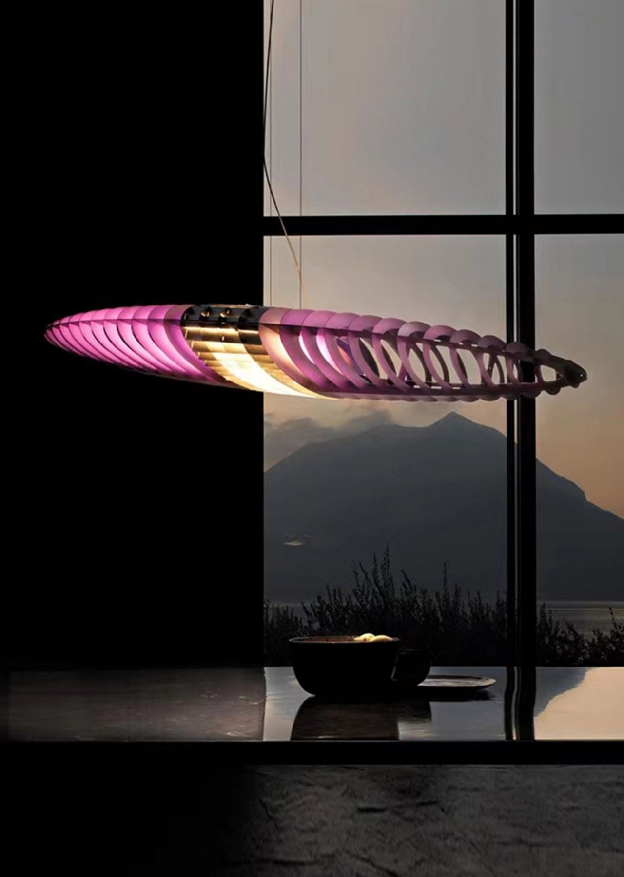 A breathtaking, multi-pendant lighting system that doubles as a kinetic art installation. Each light features a sleek, elliptical form composed of numerous thin, layered slats, creating a translucent, skeletal effect. The internal light sources illuminate these layers, revealing vibrant, shifting colors—green, yellow, and purple—that cast an ethereal glow. Suspended at varying heights by fine wires, this system adds a futuristic, sculptural statement and dynamic ambient light to large modern spaces, lobbies, or dining areas.
