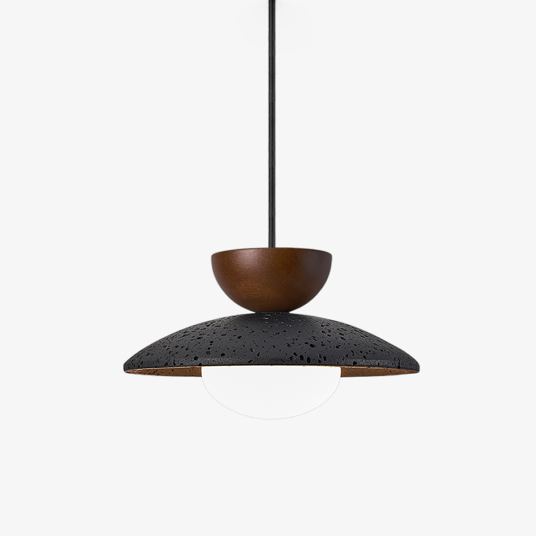 This captivating pendant lamp showcases a beautiful interplay of geometric forms and contrasting materials, creating an elegant focal point for any modern space. The design features a broad, disc-shaped shade with a striking porous black finish, reminiscent of lava stone or a natural, textured mineral. Beneath this earthy shade, a soft opal glass sphere diffuses the light, casting a gentle, even glow. Perched atop the disc is a smooth, warm walnut wood dome, seamlessly connecting the fixture to its suspension cord. This thoughtful combination of rough and smooth, dark and luminous, brings an organic modern sophistication perfect for dining areas, living rooms, or over kitchen islands.