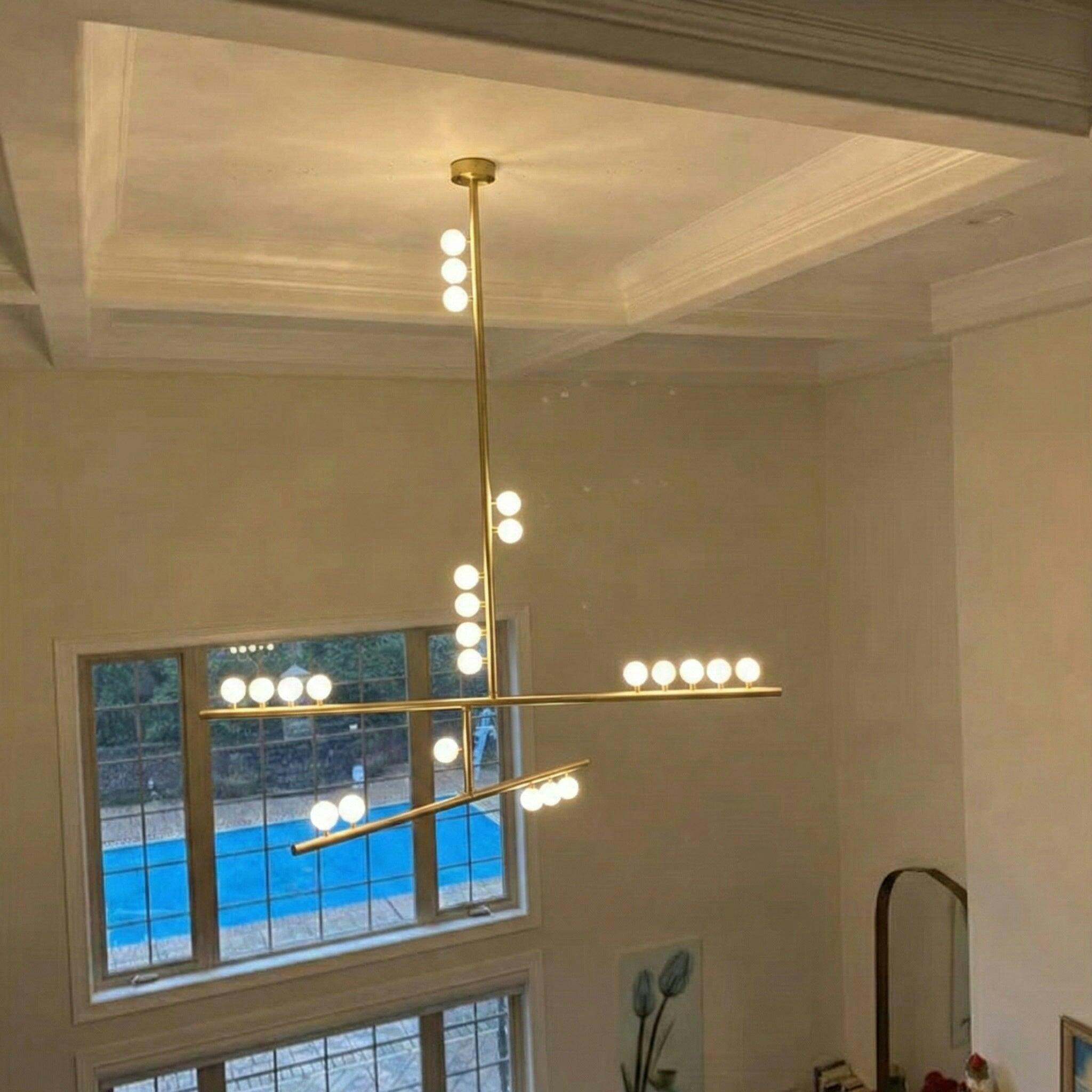 Brass Glass Drop Chandelier is an elegant fusion of form and function, featuring flexible joints that allow its slender rods to gracefully tilt, capturing the essence of organic movement. Adorned with delicate blown glass orbs reminiscent of pearls, and available in finishes like brushed brass and tarnished nickel, this chandelier brings a touch of natural sophistication to any space.