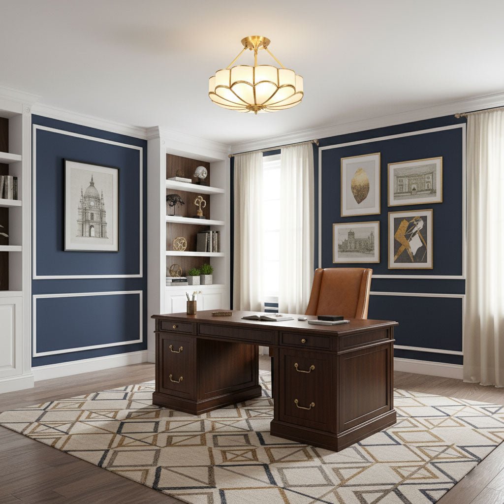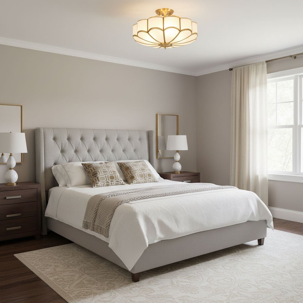 Elevate your home's atmosphere with this exquisite Flower Shape Glass Ceiling Light. Made from frosted glass and brass finish, it offers gentle illumination and a three-dimensional visual effect. Suitable for any space in your home, it adds a touch of postmodern light luxury. Perfect for bedrooms, studies, balconies, and aisles.