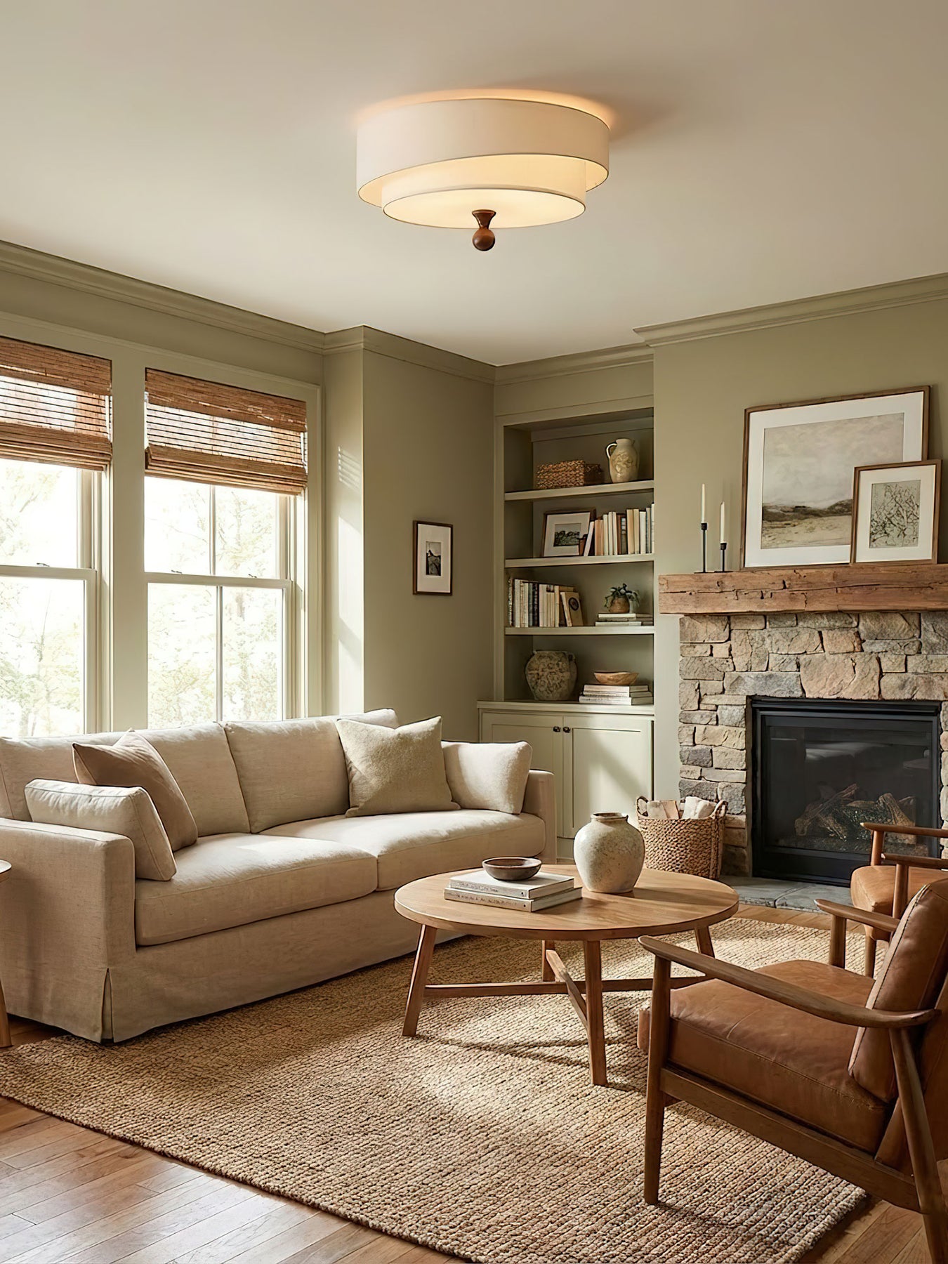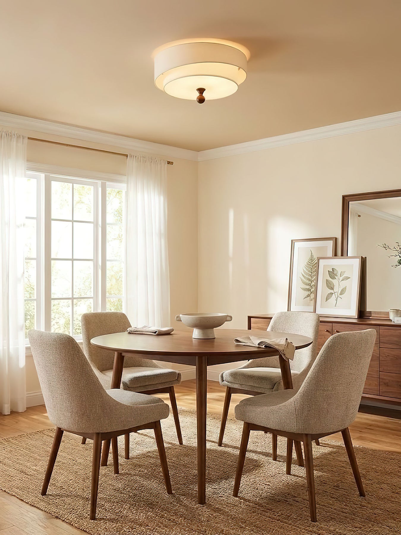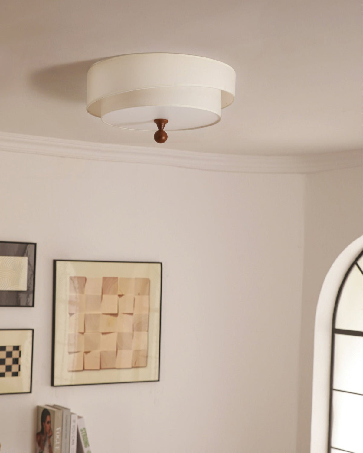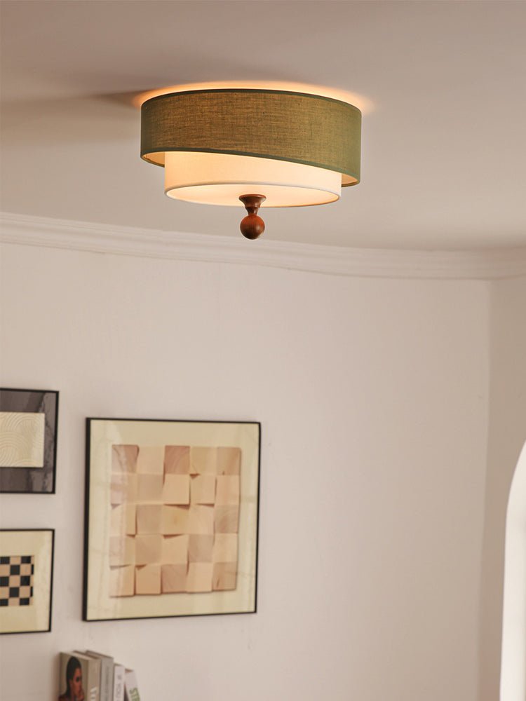 This ceiling light features a layered design with fabric shades in earthy tones. The combination of textured outer and smooth inner shades, along with a wooden accent detail, gives it a warm and elegant look. Perfect for adding a touch of refined charm to living rooms, bedrooms, or dining areas, it diffuses light softly to create a cozy ambiance.