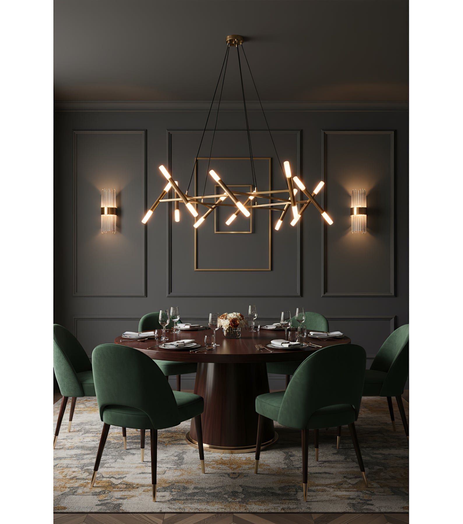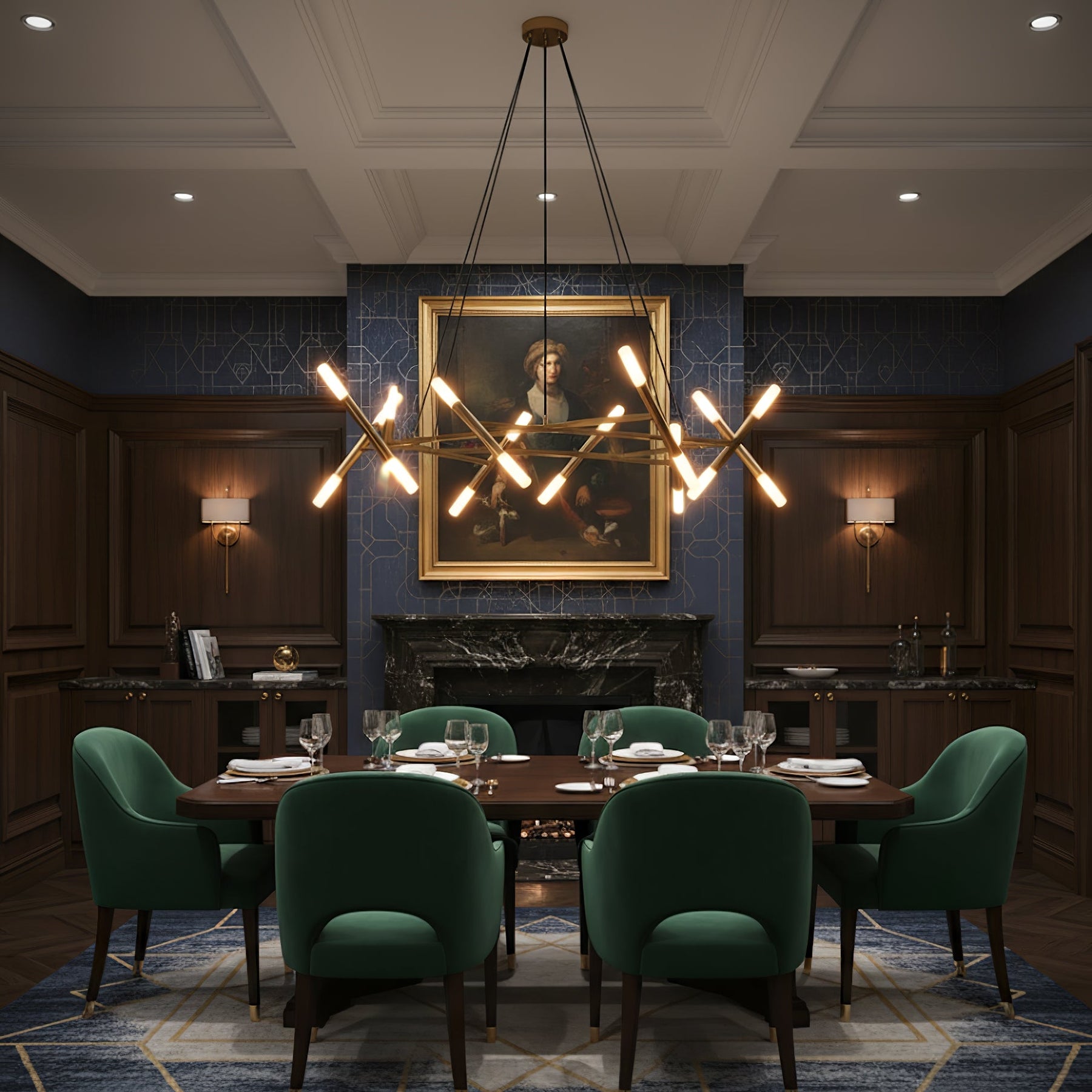 الأسقف العالية (١٠ أقدام أو أكثر): يمكن للغرف ذات الأسقف العالية أن تستوعب تركيبات إضاءة أكبر وأكثر دراماتيكية. استغل ارتفاع الغرفة لصالحك عن طريق اختيار تركيبات أطول تجذب العين لأعلى وتخلق اهتمامًا بصريًا.