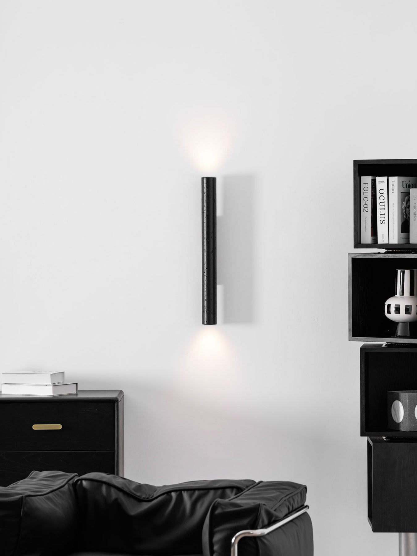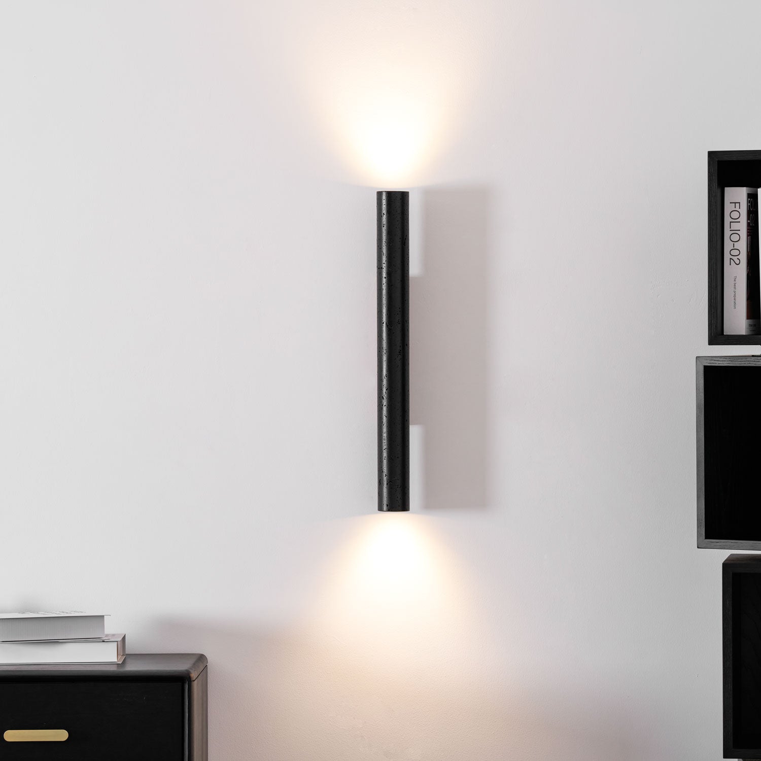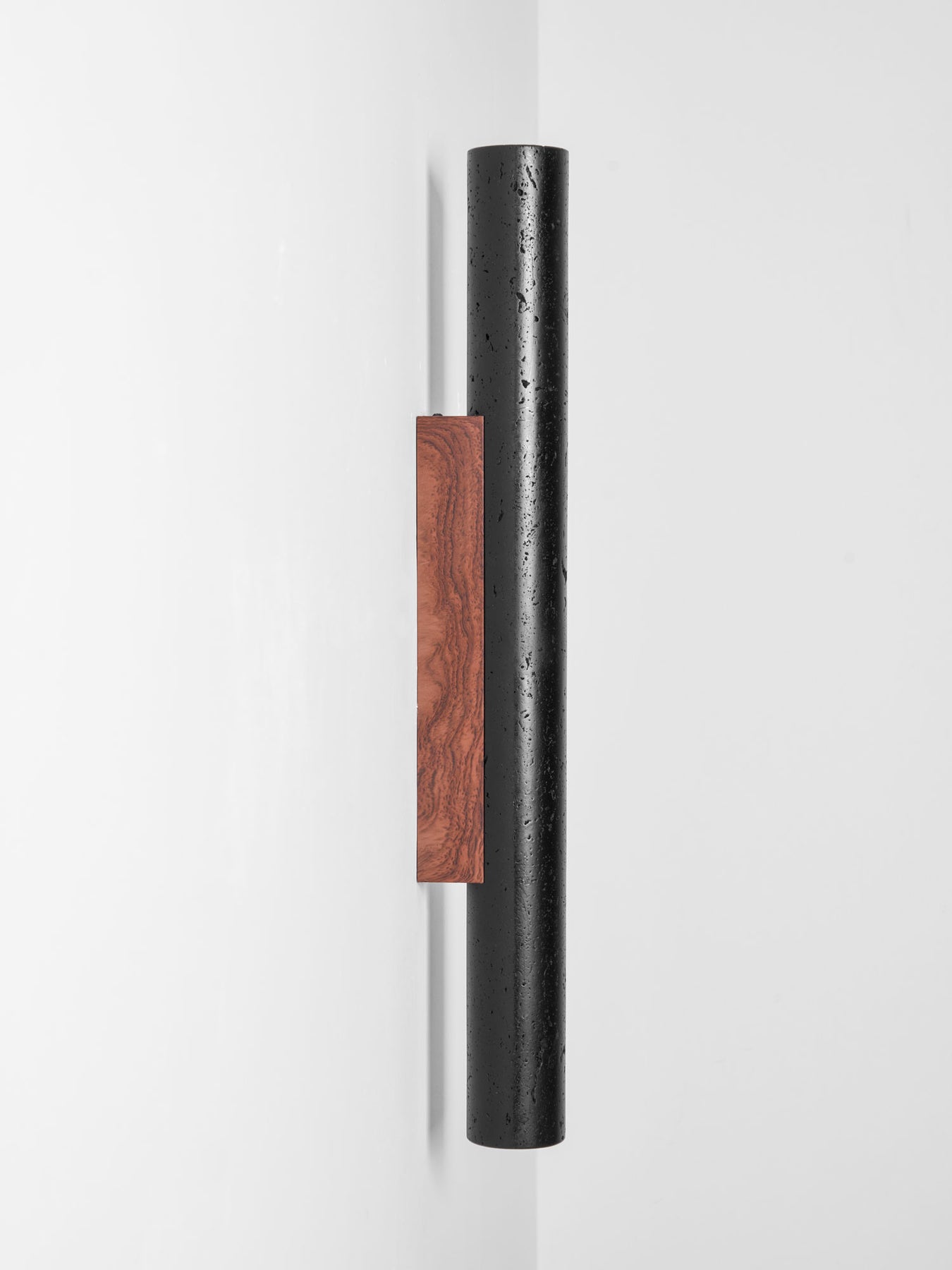 The Volcanic Noir Wall Sconce by Vakkerlight combines elemental texture with refined design. Featuring a cylindrical body crafted from lava rock-inspired material in deep matte black, it brings a raw yet sophisticated presence to any modern or minimalist space. Mounted on a warm wooden base, the fixture emits soft, ambient up-and-down lighting, perfect for hallways, living rooms, or contemporary bedrooms. This piece is both a lighting solution and a sculptural statement, offering a striking blend of nature and design.