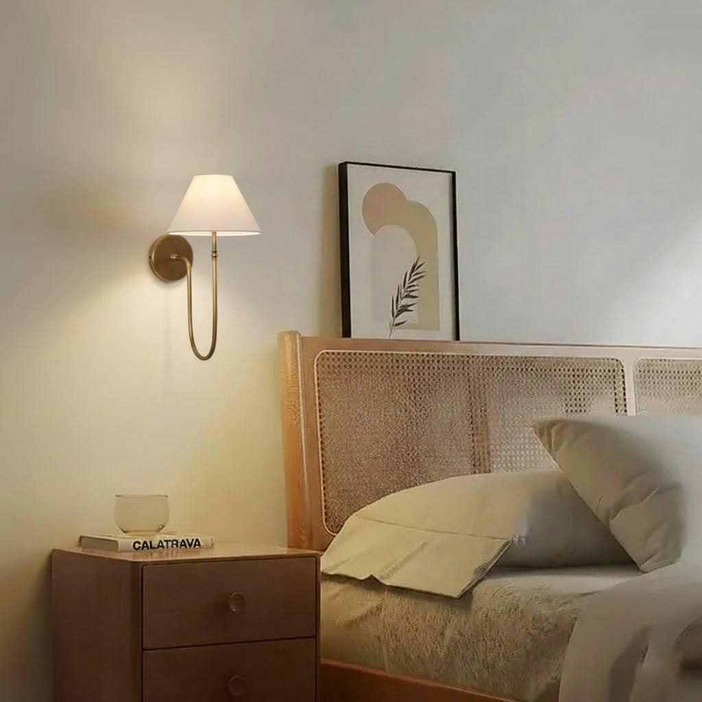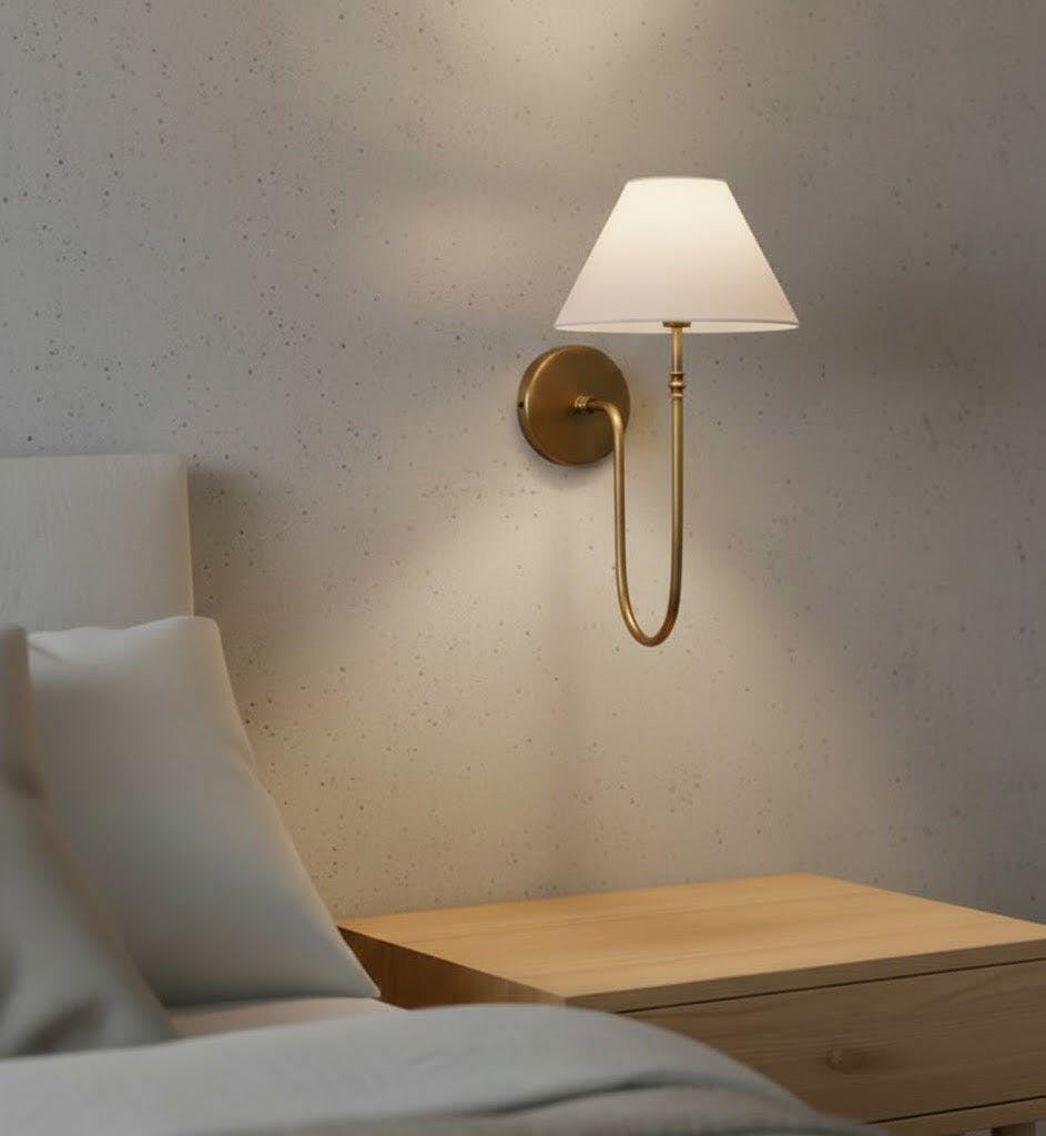 The Collins Wall Light adds a touch of sophistication to any space with its sleek black metal arm, classic white fabric shade, and subtle brass accents. This versatile wall lamp provides bedside lighting or accents living spaces with a soft, warm glow. Elevate your interior with its understated charm and refined design.