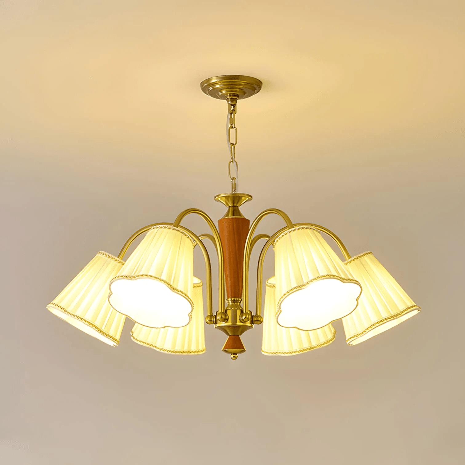 Infuse your space with nostalgic charm and soft floral elegance. The Bellora Bloom Chandelier features six scalloped fabric shades reminiscent of delicate petals, gently radiating a warm, ambient glow. Crafted with a wood-accented core and golden curved arms, it's the perfect centerpiece for vintage-inspired or romantic interiors.