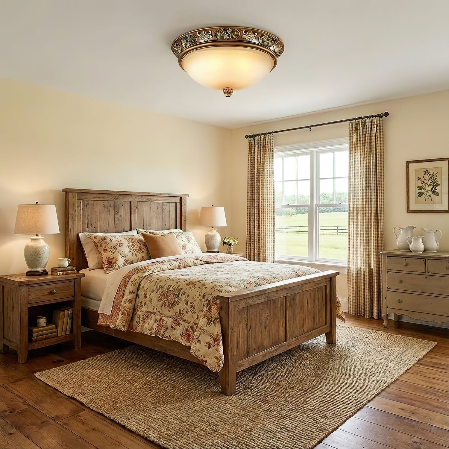 • تركيبات السقف: تستفيد غرف النوم من الإضاءة الهادئة والمحيطة. استخدم صيغة أبعاد الغرفة لضمان تناسب حجم تركيبات السقف بشكل صحيح. تُعدُّ وحدات الإضاءة شبه المُحكمة أو المُحكمة خيارًا جيدًا للإضاءة العامة، بينما تُوفر الشمعدانات أو مصابيح السرير إضاءة مُركزة للمهام.