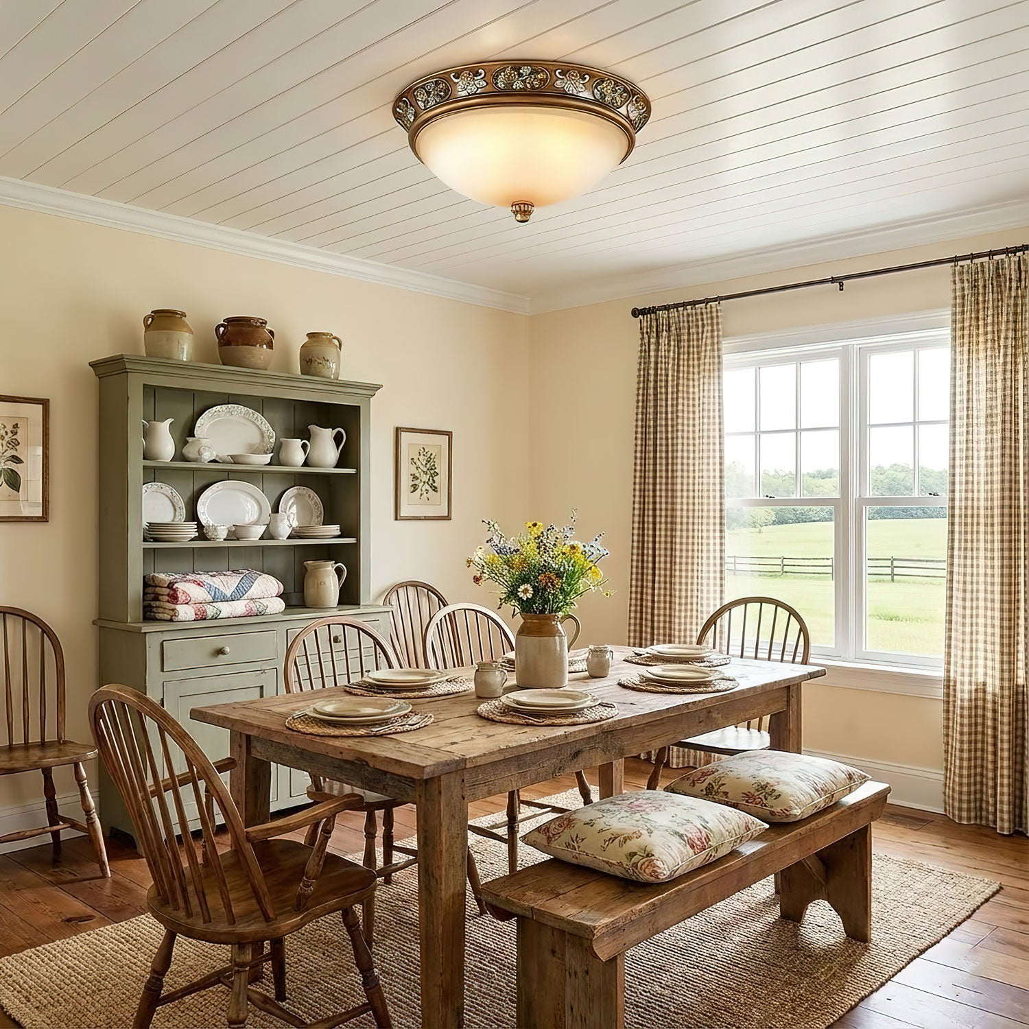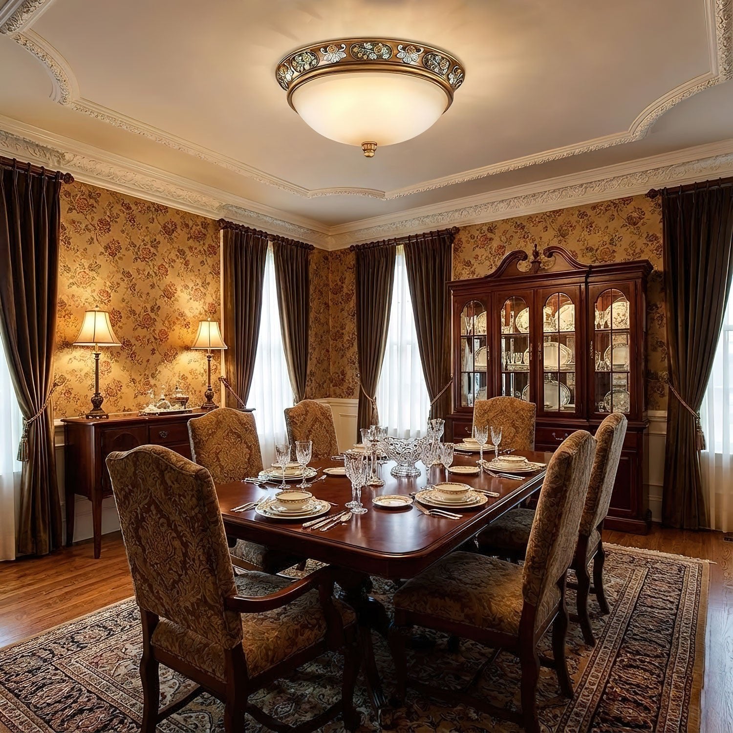 • الثريات: باعتبارها العنصر الأساسي في غرفة الطعام، يجب أن يكون عرض الثريا مناسبًا لحجم طاولة الطعام، ولكن ليس واسعًا جدًا بحيث يطغى على المساحة. قطر يتراوح بين 1/2 إلى 2/3 من عرض الطاولة يُعدّ دليلاً جيداً.