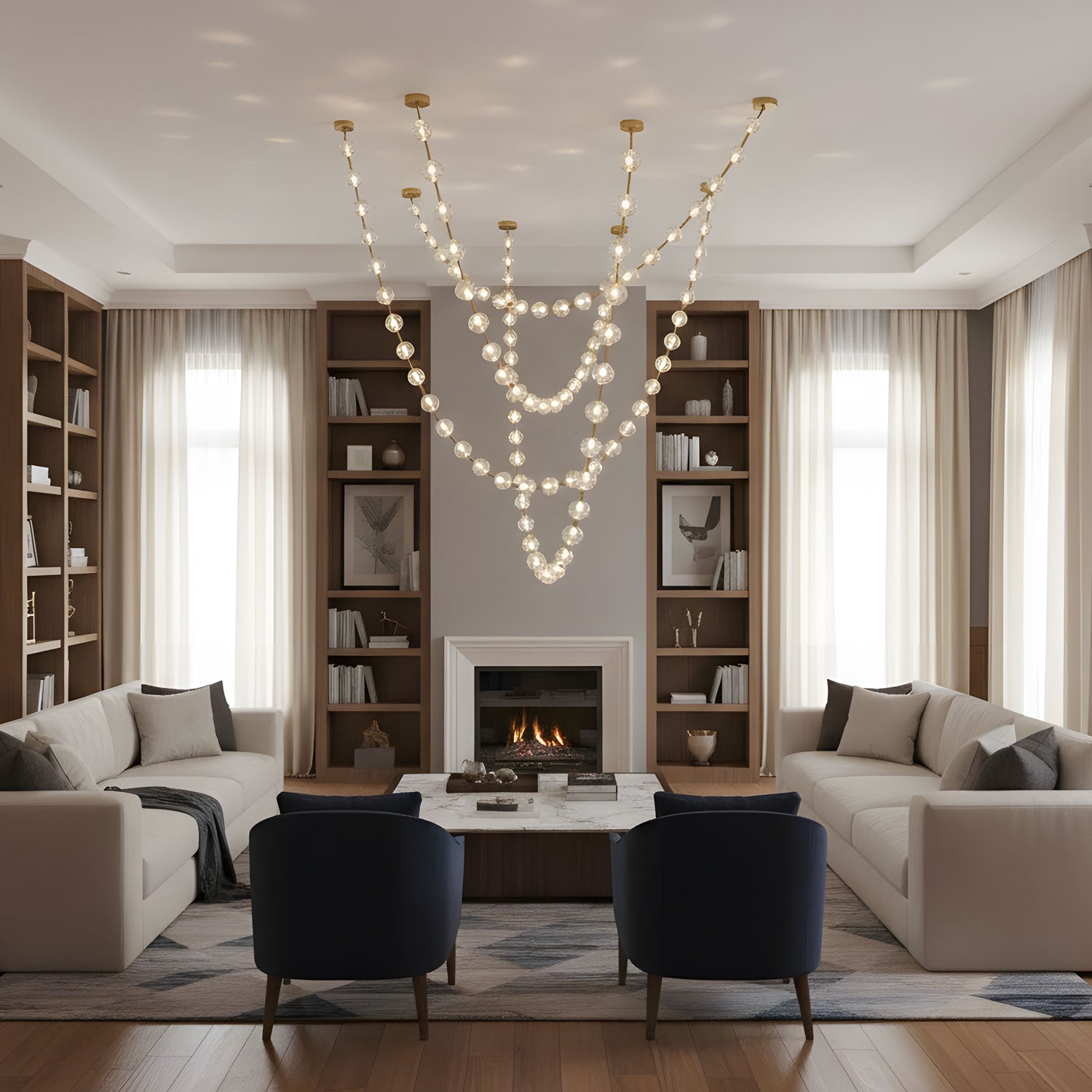 The Celestial Necklace Acrylic Chandelier by Vakkerlight brings the elegance of fine jewelry into the world of lighting design. Inspired by the graceful drape of a luxurious necklace, this chandelier features cascading strands of textured acrylic spheres, delicately connected by golden metal links. The semi-transparent acrylic globes emit a radiant, diffused glow, creating a striking visual effect while remaining lightweight and versatile. Ideal for dining areas, stairwells, or high-ceiling spaces, this piece combines the glamour of a statement necklace with the function of modern illumination — a perfect blend of art, light, and elegance.