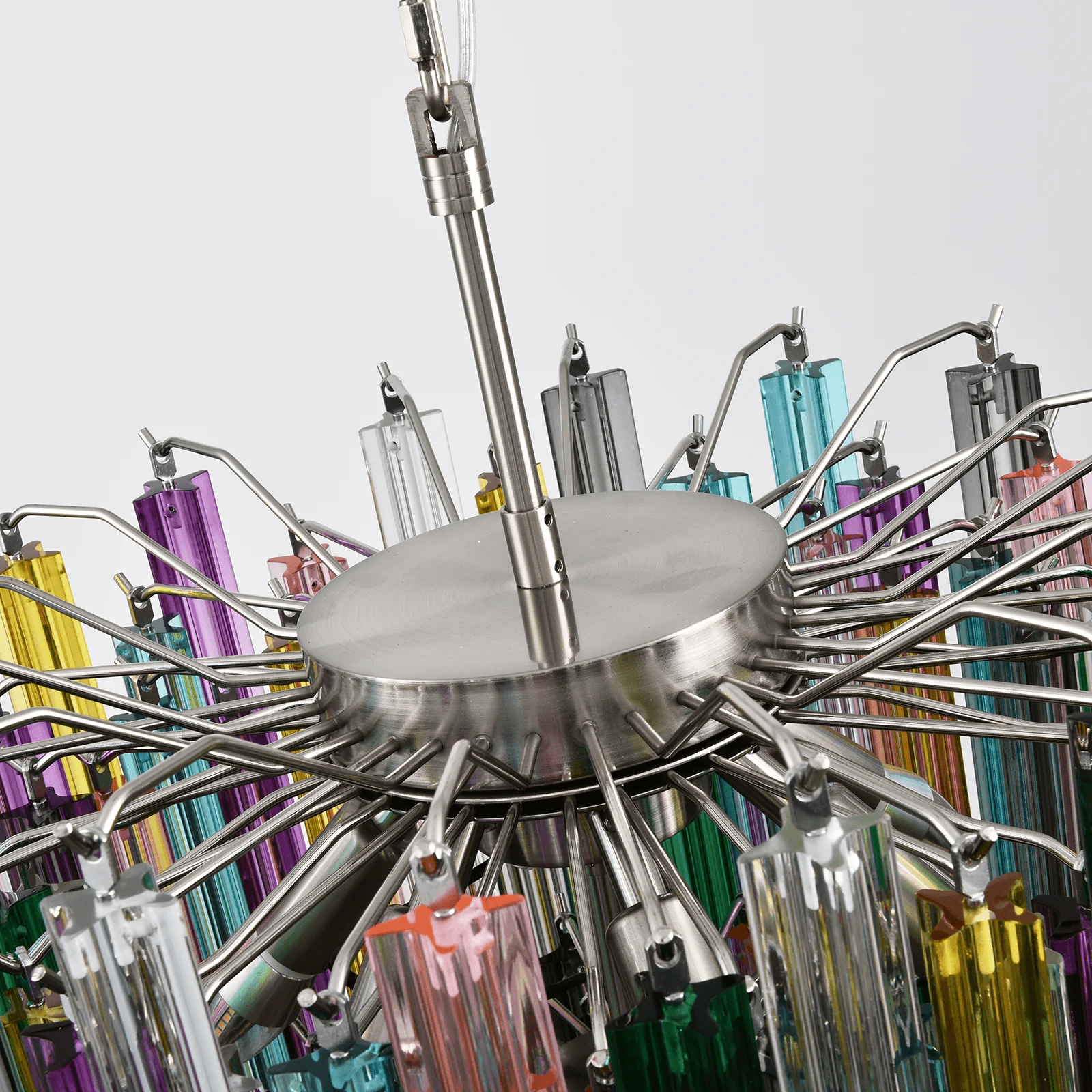 The Prismatic Murano Colorful Chandelier features an exquisite assembly of multicolored glass prisms, each meticulously crafted and polished by skilled artisans. This precise craftsmanship results in a distinctive, luxurious centerpiece that enhances any room with its vibrant, elegant glow. The carefully arranged prisms refract light beautifully, creating a captivating ambiance that elevates both modern and classic interiors.