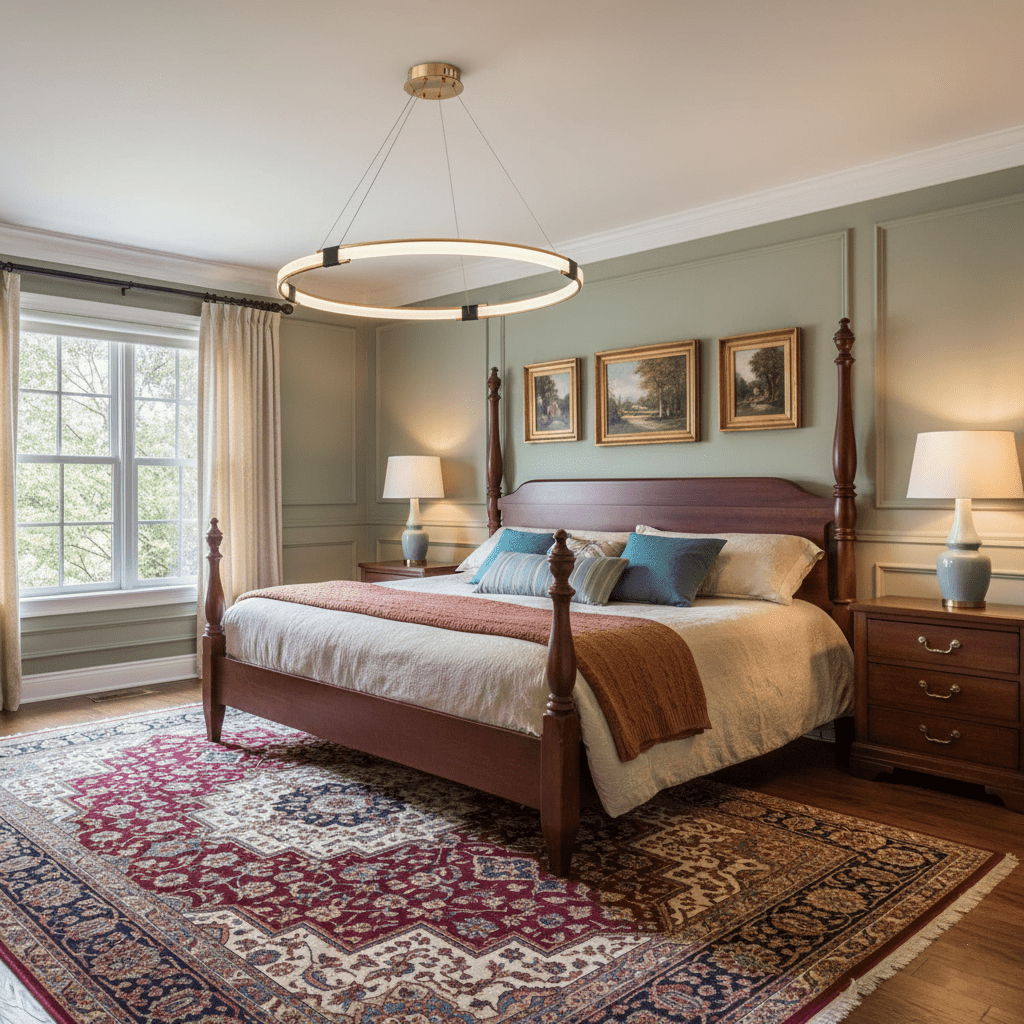 الأسقف القياسية (٩-١٠ أقدام): تُعدّ الثريات والأضواء المُعلقة مثالية للغرف ذات ارتفاعات الأسقف القياسية، خاصةً في غرف الطعام والمداخل. تأكد من أن الجزء السفلي من التركيب يبعد مسافة ٧ أقدام على الأقل من الأرضية.