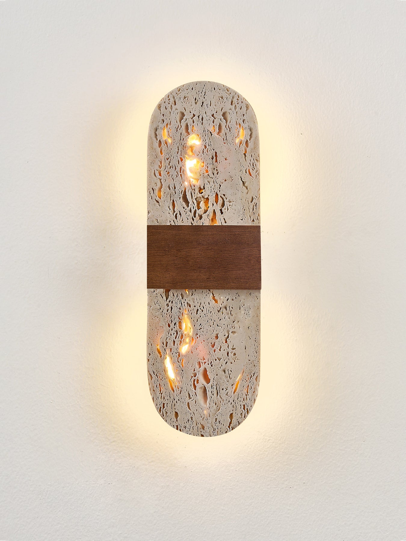 The Vakkerlight Solis Travertine Wall Light beautifully combines natural travertine with a rich wooden accent. The stone's unique texture, illuminated by the warm light, creates a soothing ambiance, while the wood accent adds a touch of earthy elegance. This wall light is perfect for adding a sculptural element and soft illumination to any modern or rustic interior. Ideal for living rooms, hallways, or bedrooms.
