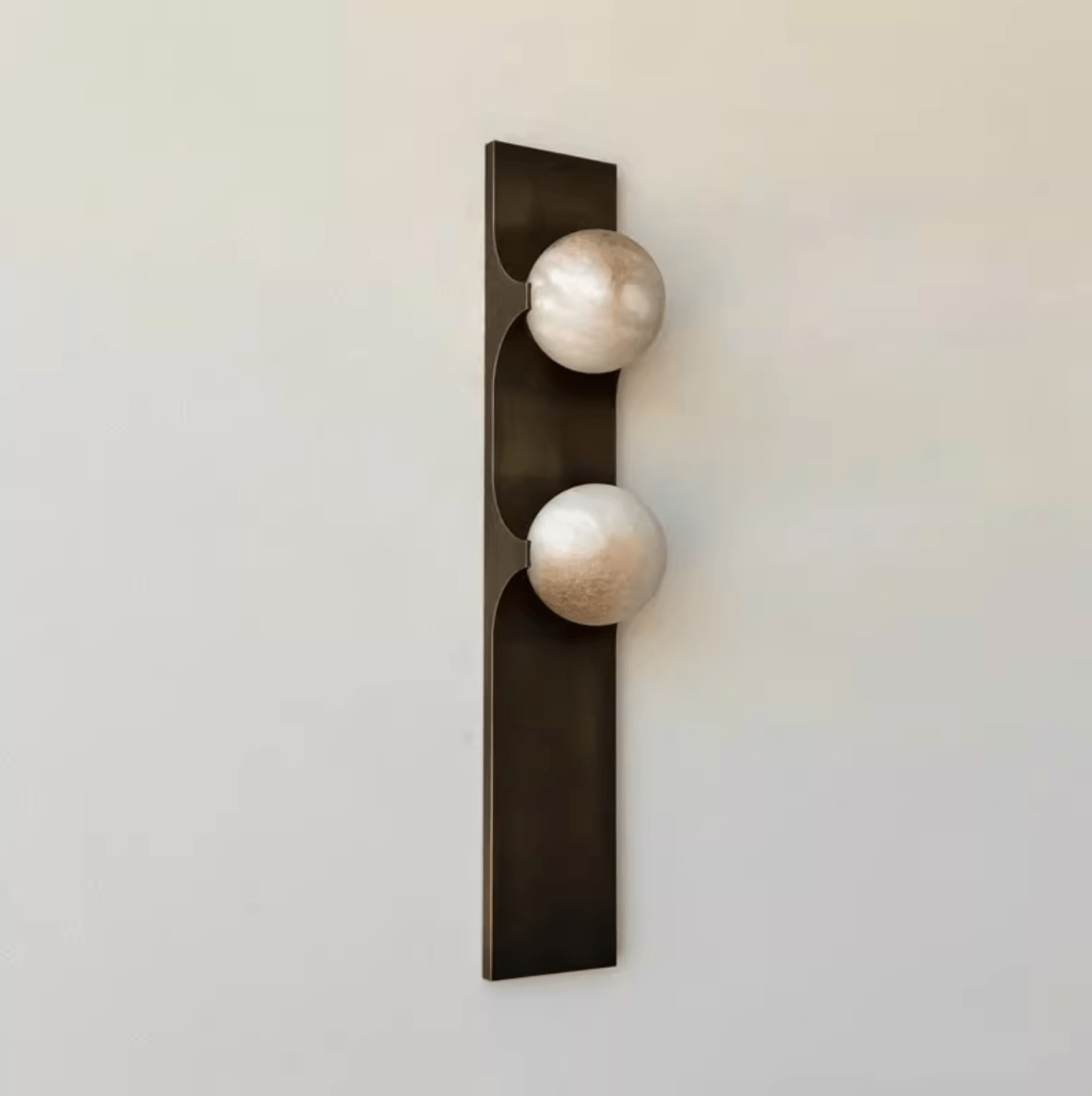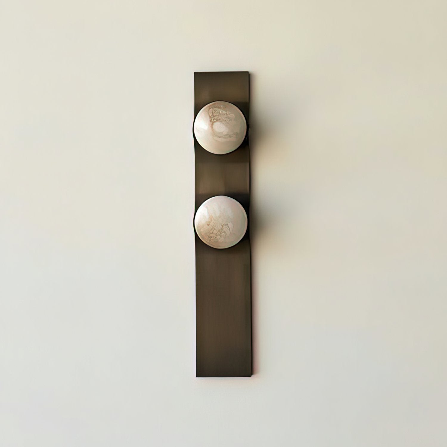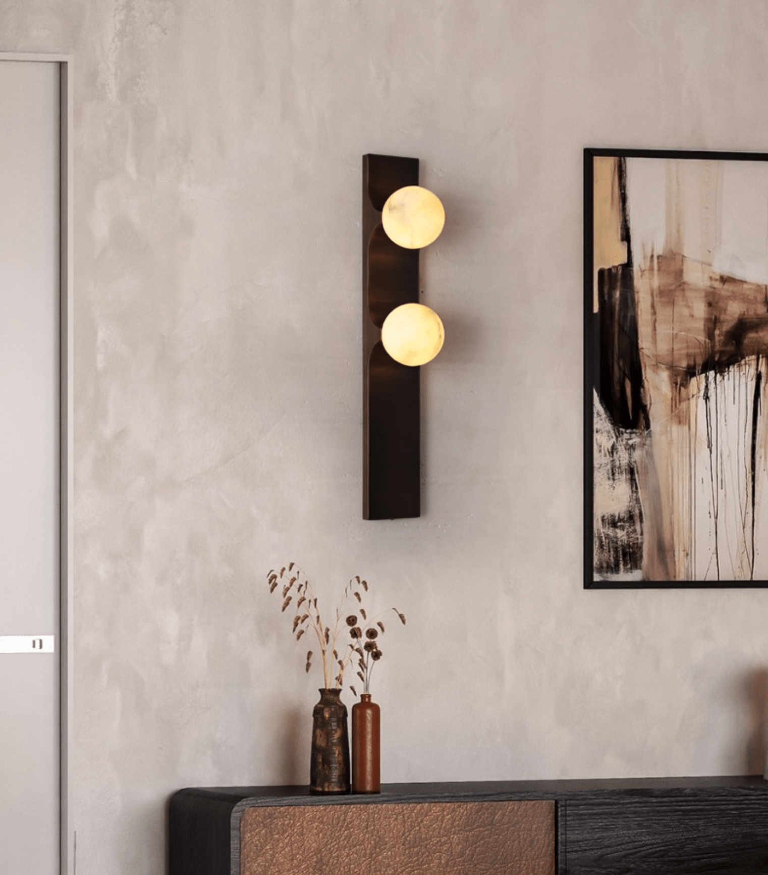 Introduce contemporary sophistication with the Geo-Lumen Bar Wall Sconce by Vakkerlight. This striking fixture features a sleek, vertical metallic bar in a rich, dark bronze or brushed brass finish, serving as a minimalist canvas for two exquisite circular light sources. Each disc is crafted from translucent Alabaster, showcasing unique natural veining that creates a warm, organic visual texture when illuminated. The light gently emanates from these stone circles, casting a soft, inviting glow upwards and downwards along the wall, while the robust linearity of the metal bar adds a clean, architectural element. Perfect for flanking doorways, adorning hallways, or adding an artistic touch to modern living spaces, the Geo-Lumen Bar exemplifies Vakkerlight's fusion of natural elegance and cutting-edge design.