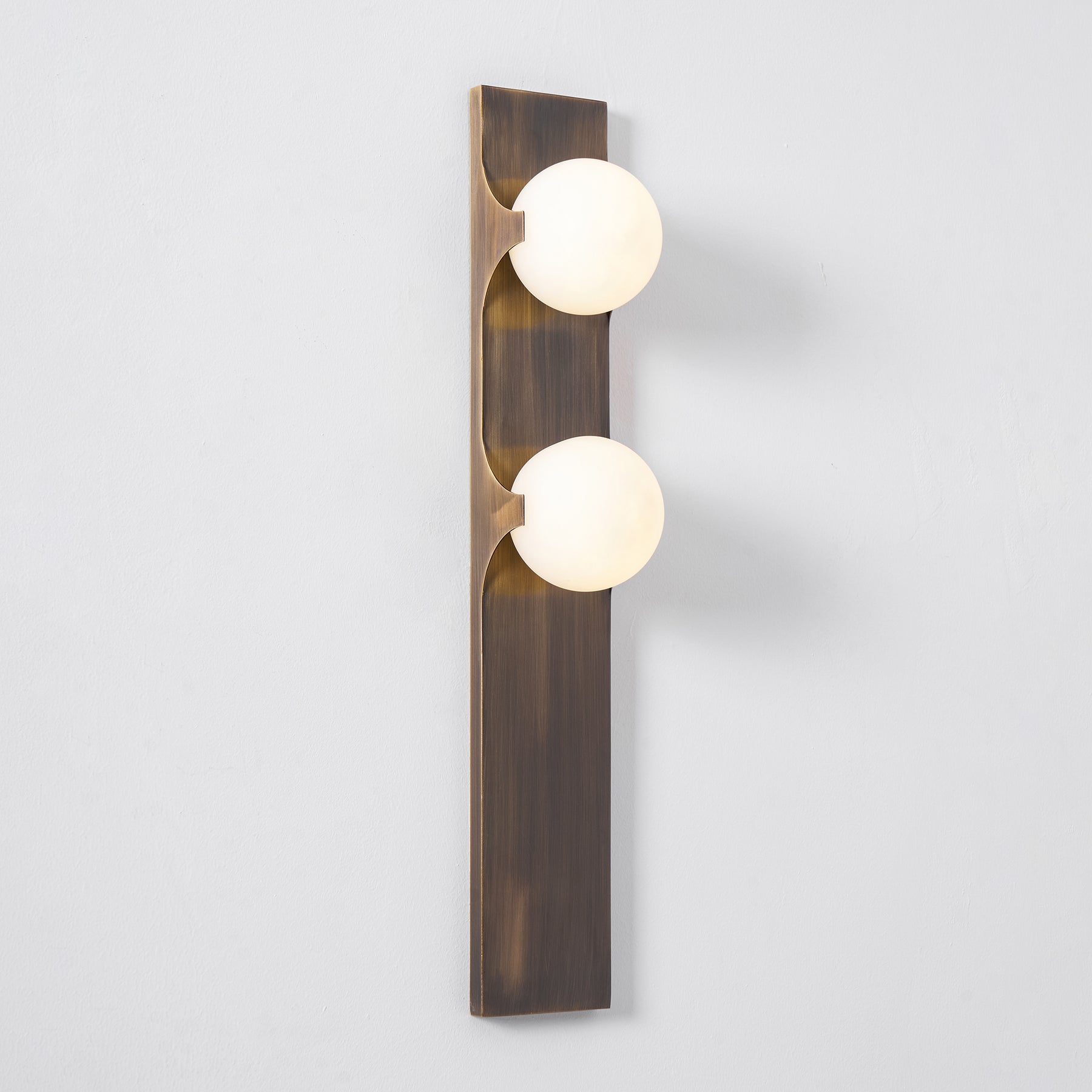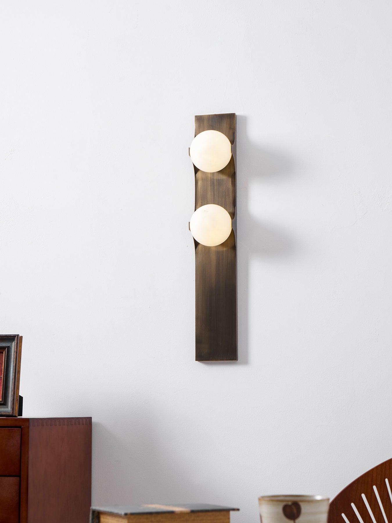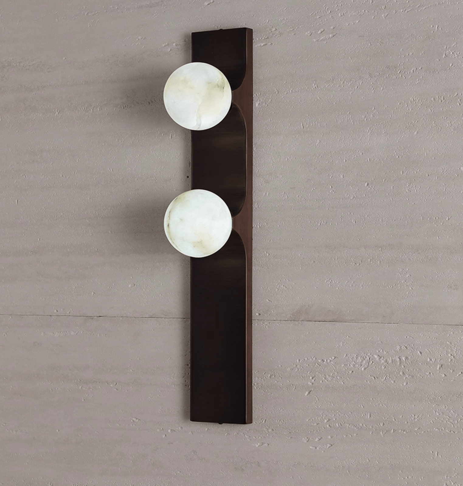 Introduce contemporary sophistication with the Geo-Lumen Bar Wall Sconce by Vakkerlight. This striking fixture features a sleek, vertical metallic bar in a rich, dark bronze or brushed brass finish, serving as a minimalist canvas for two exquisite circular light sources. Each disc is crafted from translucent Alabaster, showcasing unique natural veining that creates a warm, organic visual texture when illuminated. The light gently emanates from these stone circles, casting a soft, inviting glow upwards and downwards along the wall, while the robust linearity of the metal bar adds a clean, architectural element. Perfect for flanking doorways, adorning hallways, or adding an artistic touch to modern living spaces, the Geo-Lumen Bar exemplifies Vakkerlight's fusion of natural elegance and cutting-edge design.