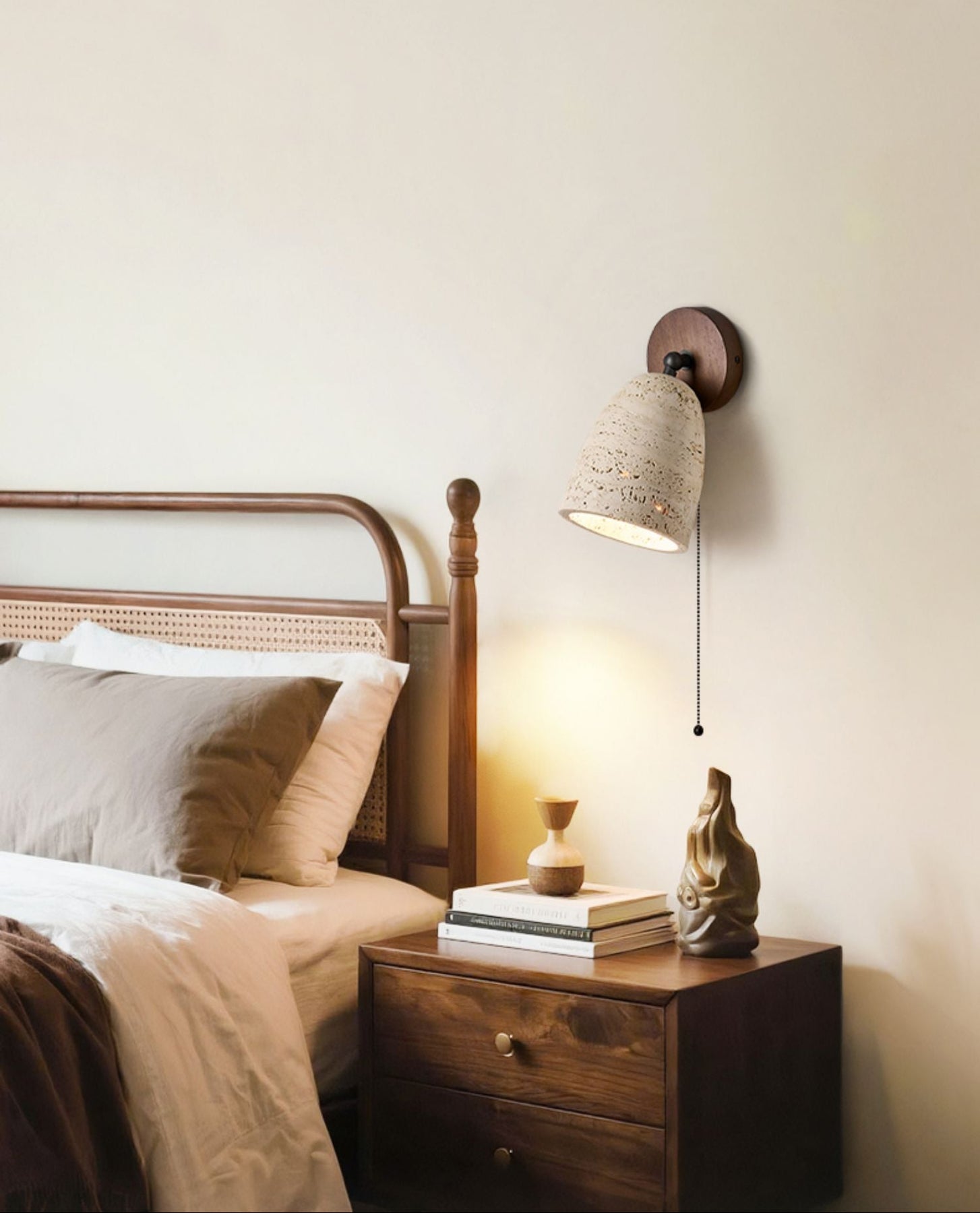 Embrace organic functionality with the Rustic Travertine Pivoting Sconce, a charming and versatile wall light from Vakkerlight. This unique fixture features a conical shade meticulously crafted from natural travertine stone, allowing light to subtly escape through its inherent pores, creating a warm, textured glow. The shade is elegantly mounted on a rich, dark wood backplate with an adjustable joint, allowing you to direct the light precisely where needed. A classic pull-chain switch adds a touch of vintage charm and convenient operation. The Rustic Travertine Pivoting Sconce by Vakkerlight is perfect for adding a touch of natural warmth and adjustable task lighting to bedrooms, reading nooks, or hallways, blending rustic appeal with modern utility.