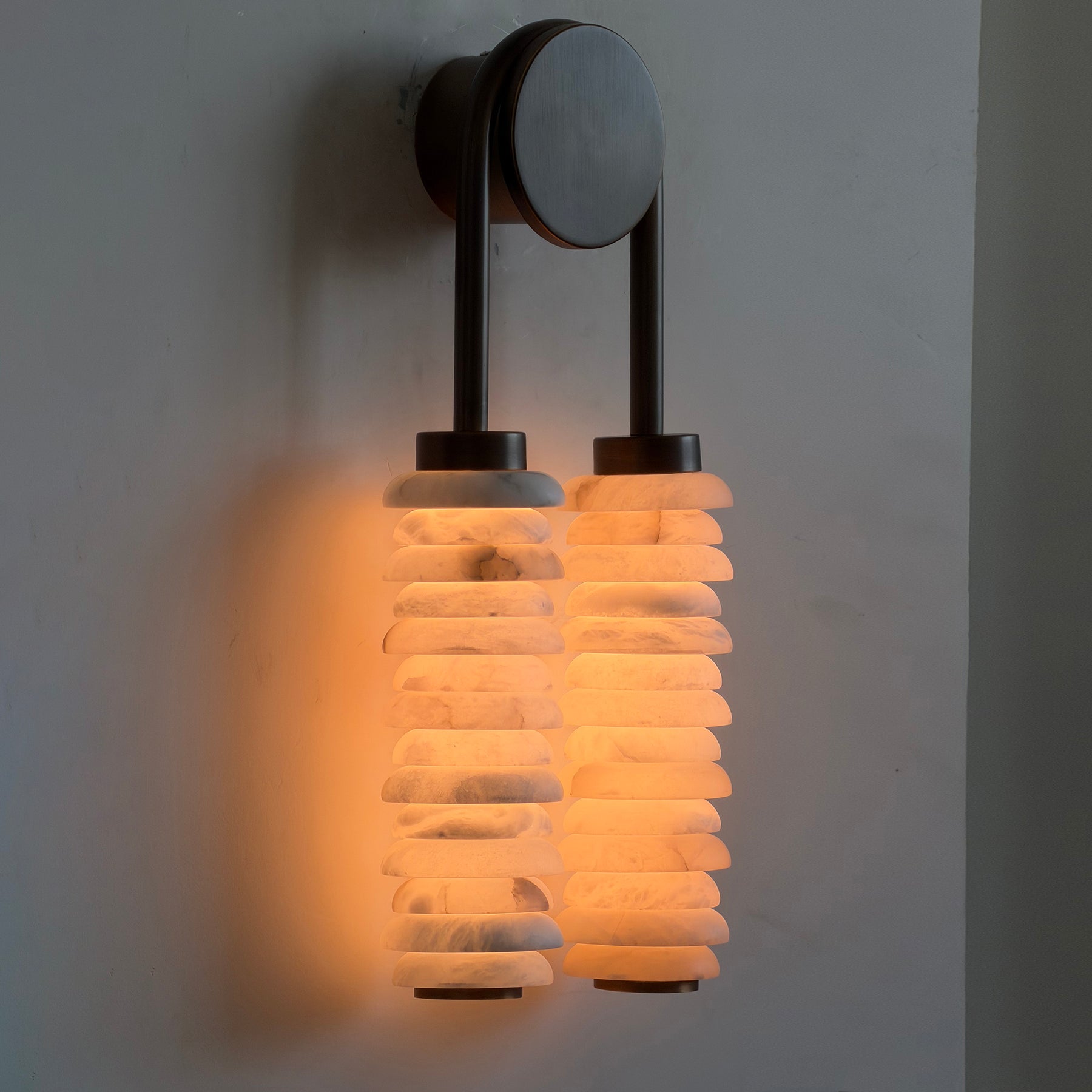 Experience the captivating interplay of light and texture with the Calla Ribbed Sconce, an architectural and elegant wall light from Vakkerlight. This striking fixture features two parallel, cylindrical shades, each meticulously crafted from individual, translucent rings of genuine alabaster. The stacked design allows light to gracefully filter through, creating a soft, rhythmic glow that highlights the stone's natural beauty. A sleek, antique brass frame suspends these luminous columns, providing a sophisticated contrast and a touch of refined industrial charm. Named 'Calla'—meaning "beautiful"—to reflect its sculptural form and radiant quality, the Calla Ribbed Sconce by Vakkerlight is perfect for adding ambient illumination and a distinctive, artistic statement to hallways, living areas, or sophisticated bathrooms.