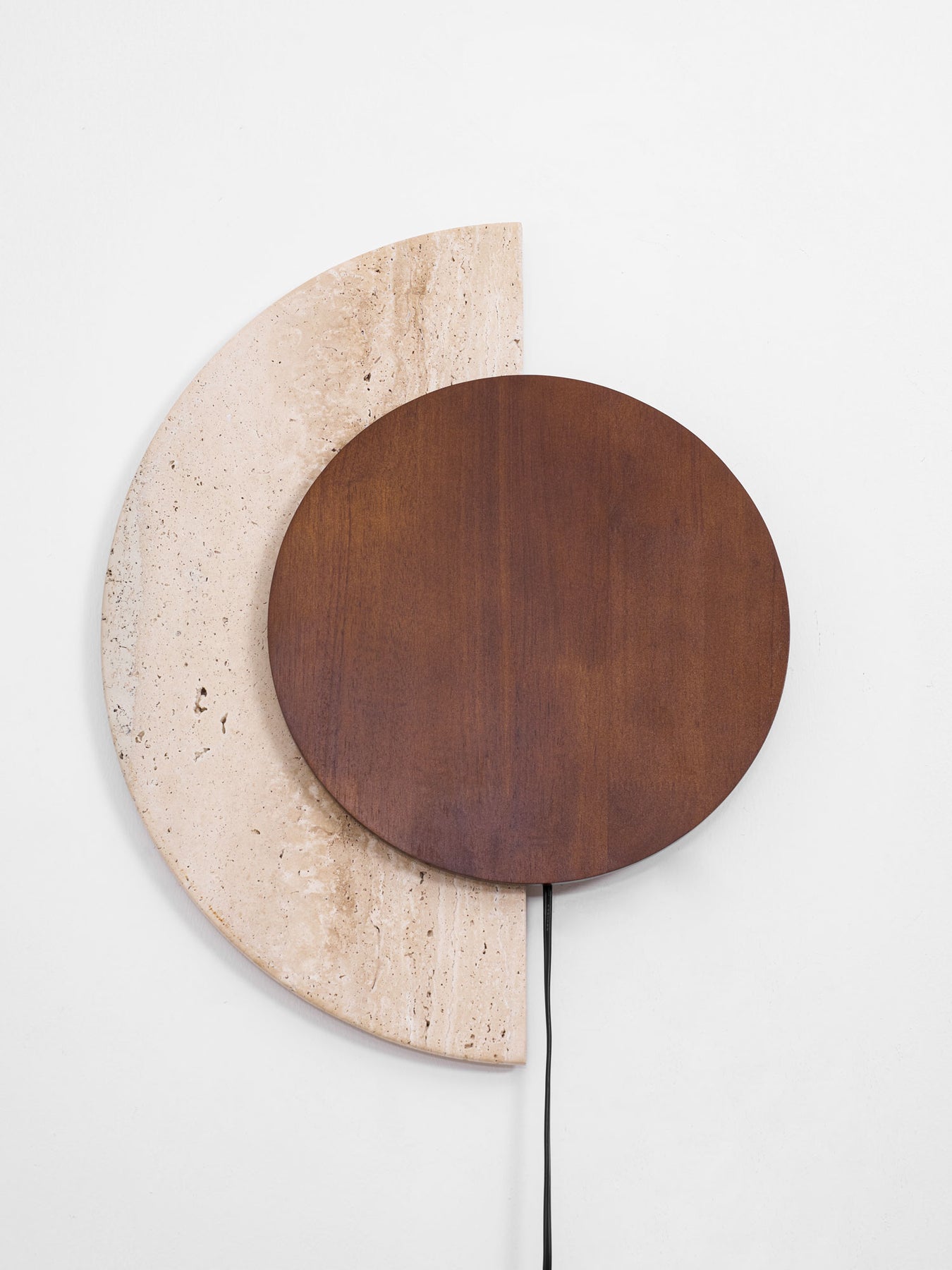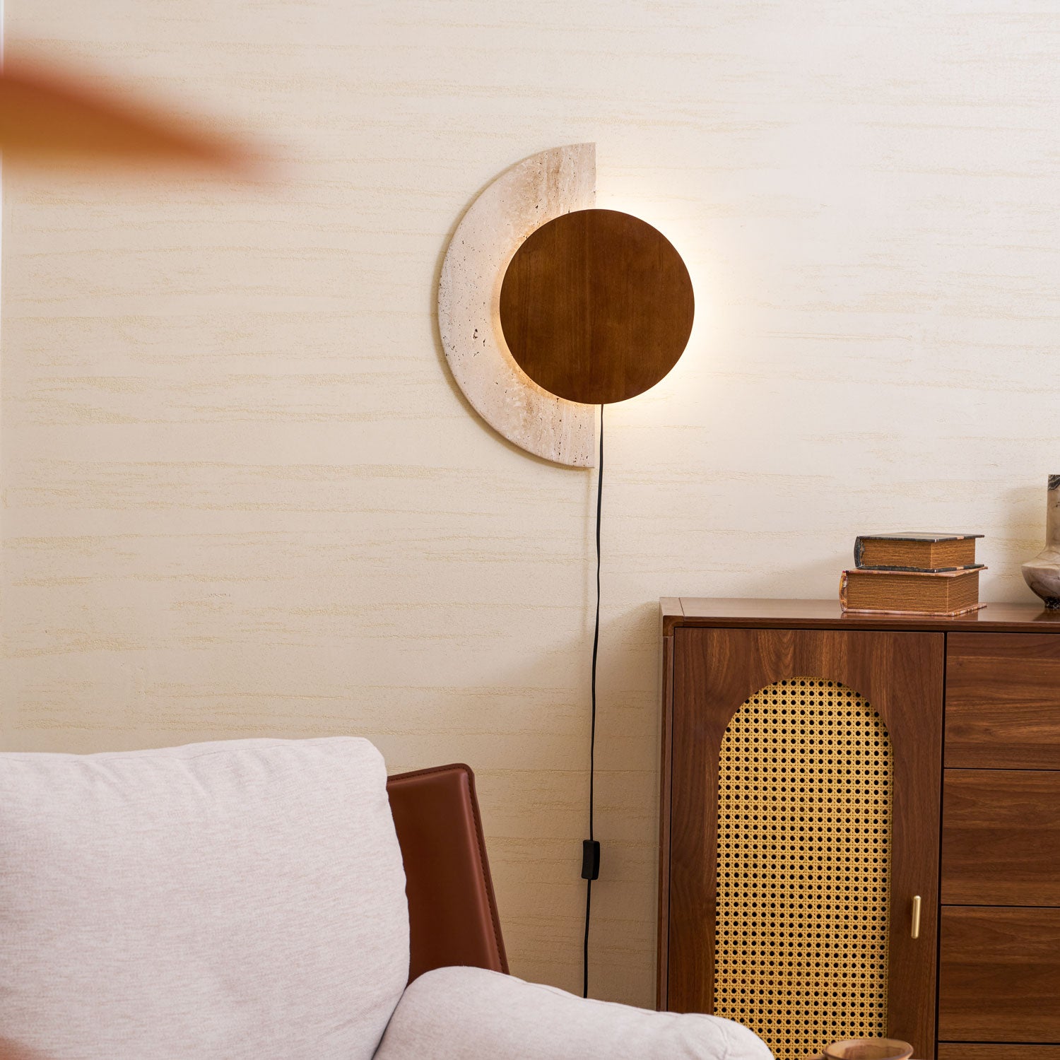 The Crescent Halo Wall Sconce by Vakkerlight merges yellow travertine with a circular wooden accent, creating a serene blend of natural materials and contemporary design.
