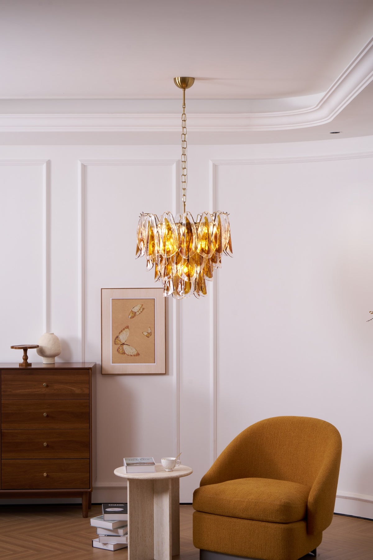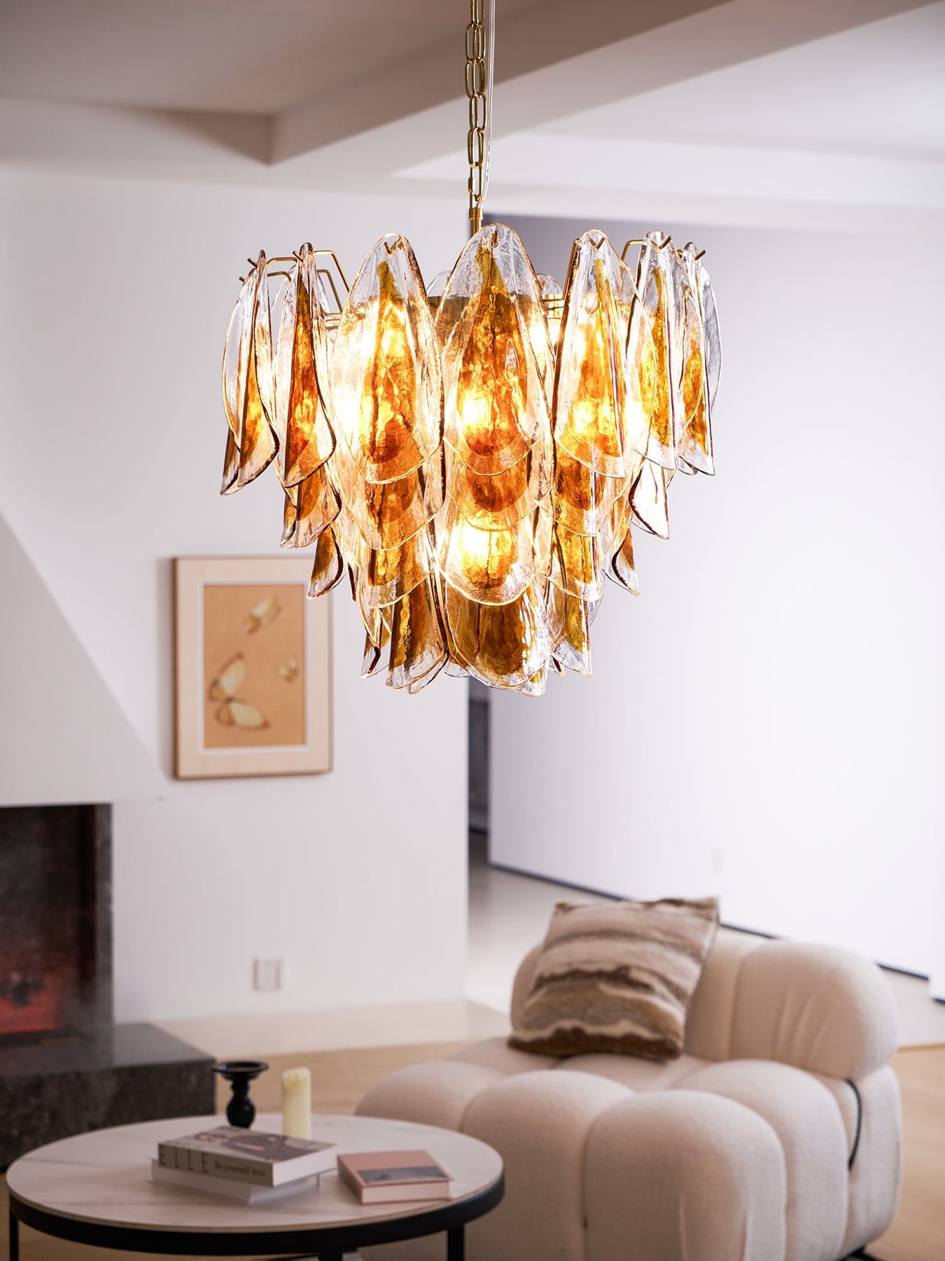 Drenched in golden amber tones and alive with radiant texture, the Solviva Chandelier brings warmth and movement to any space. Each handcrafted Murano glass leaf catches the light like molten drops, cascading from a polished frame with organic elegance.