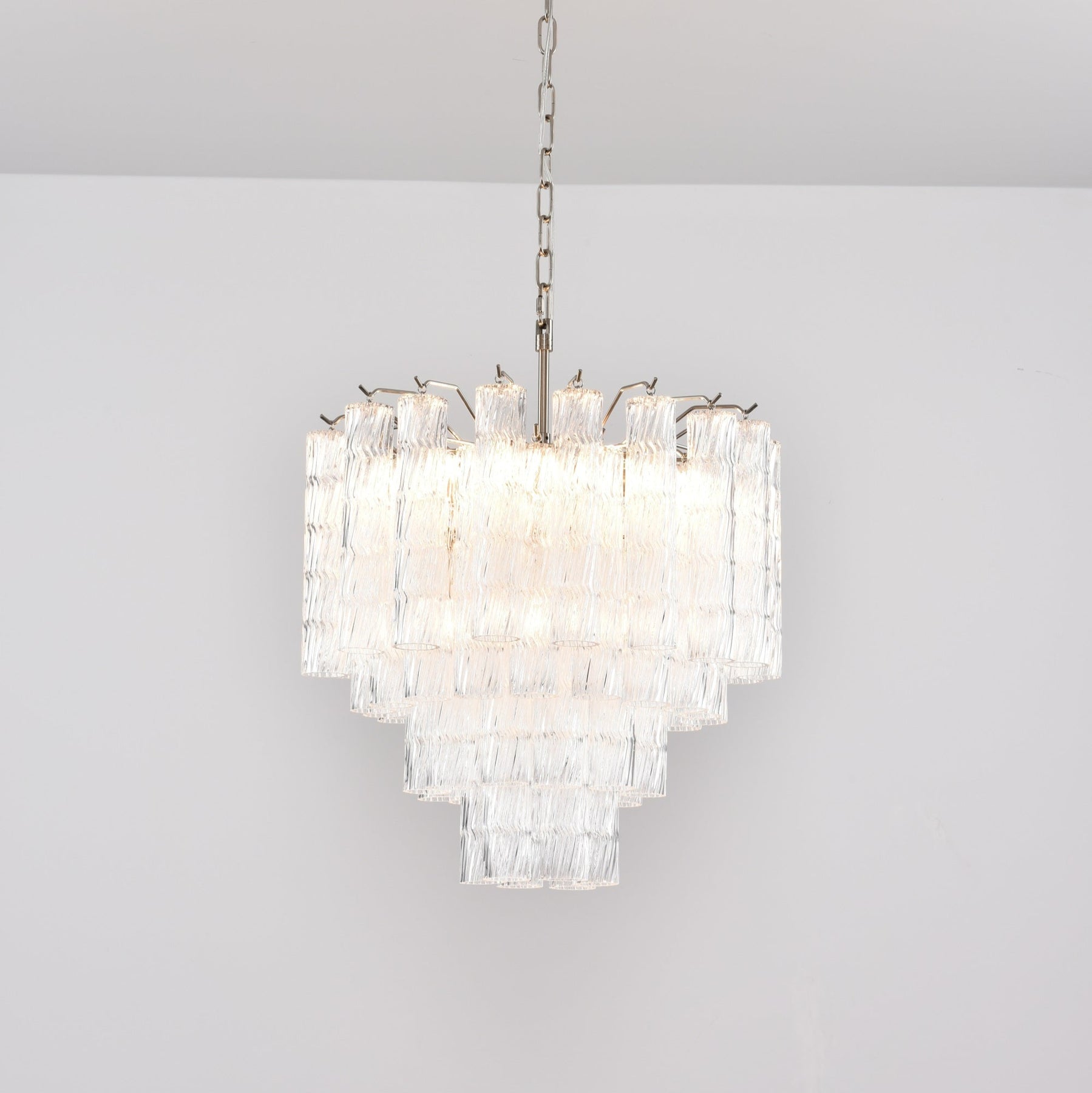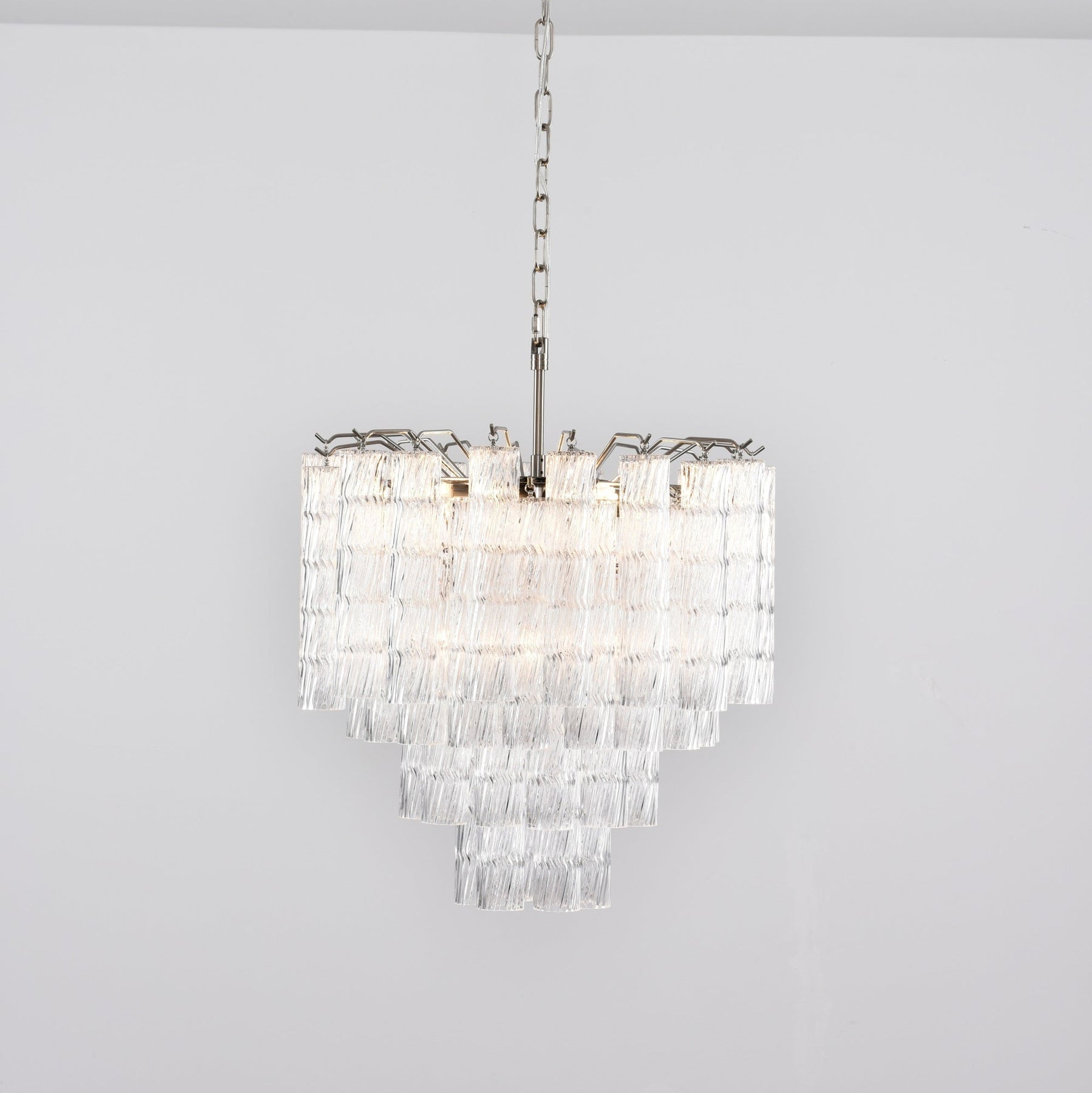 A stunning display of Murano glass mastery, the Vetrina Chandelier features tiered textures that resemble cascading waves of light. Each hand-molded glass block carries subtle ripples, creating a brilliant optical effect as light reflects and refracts across its surface.