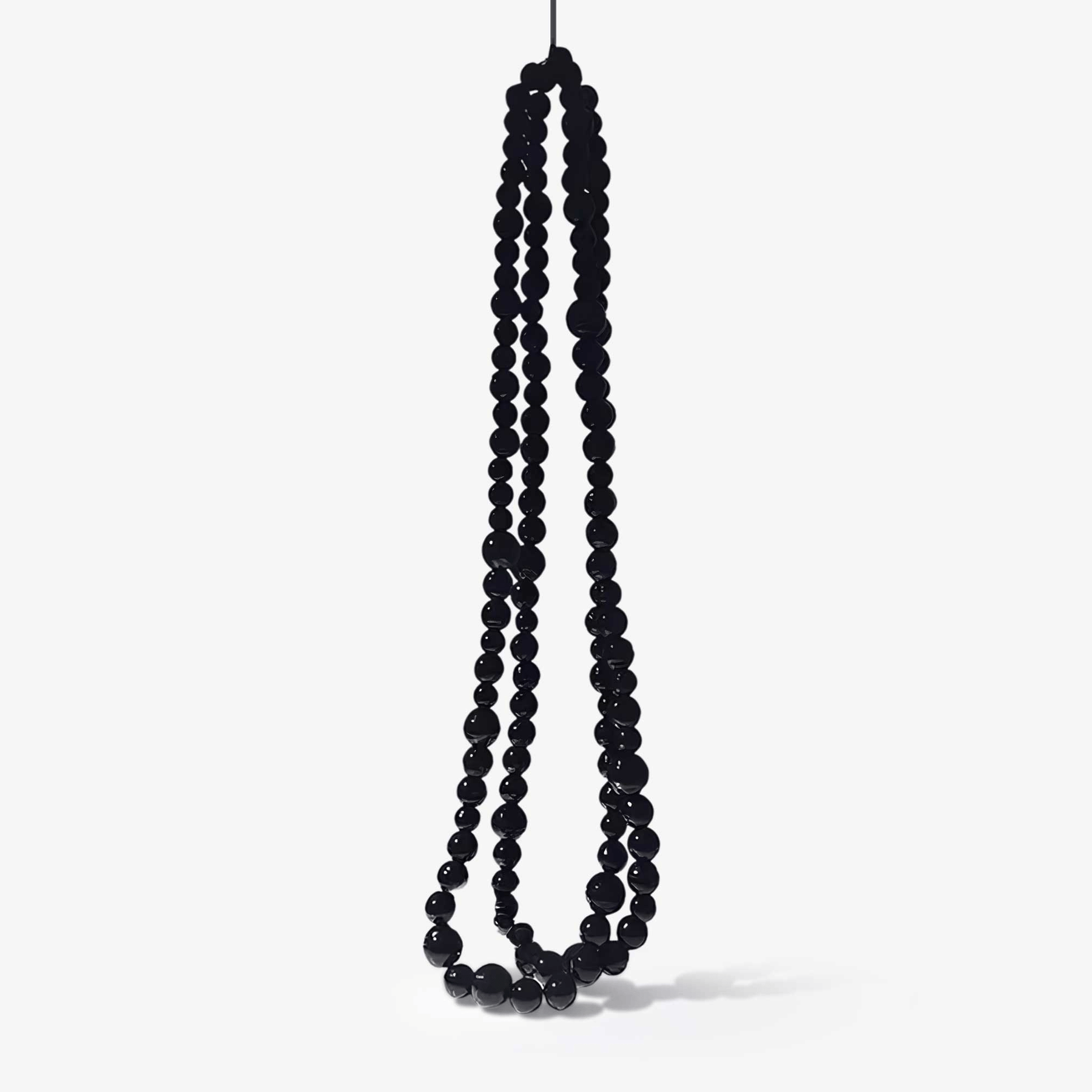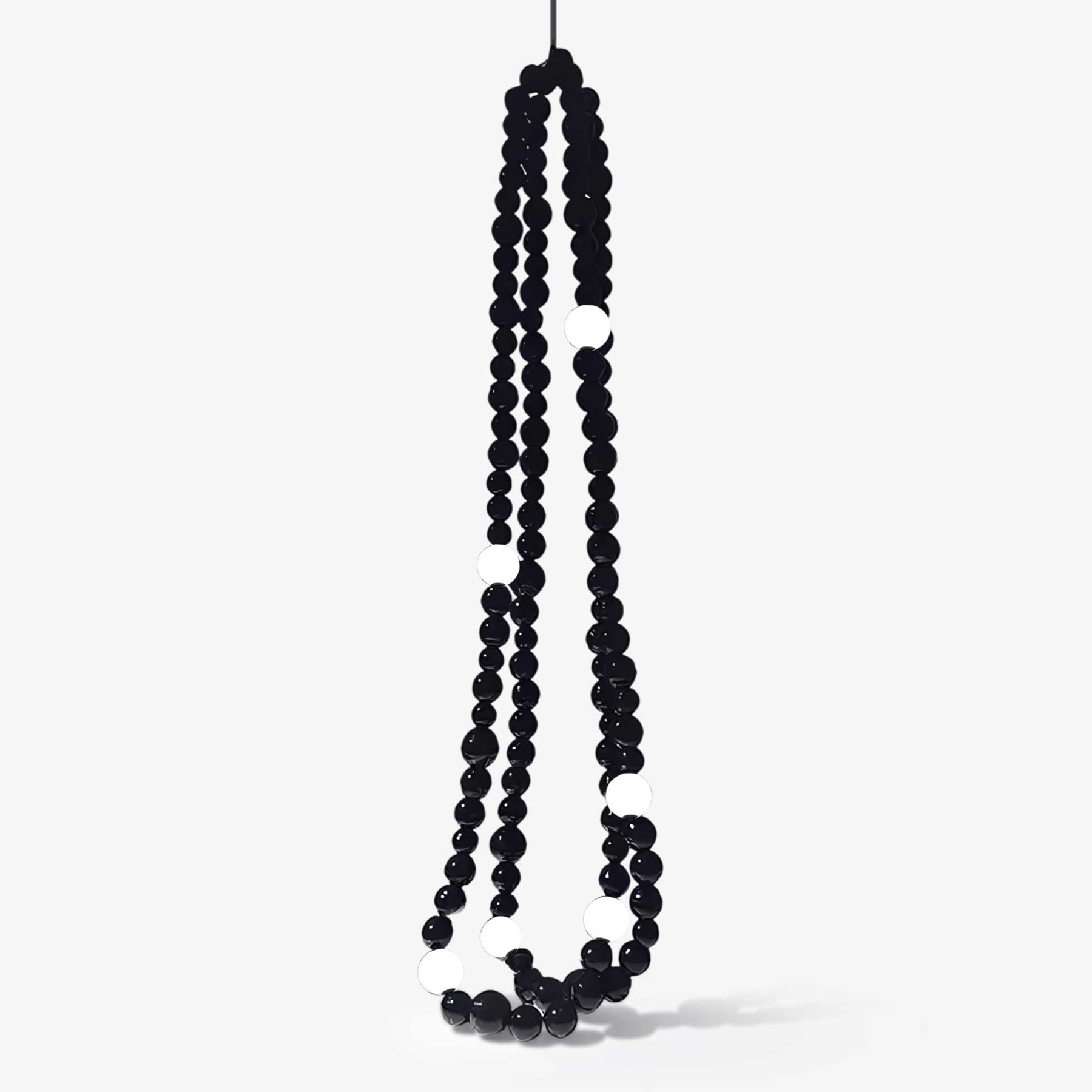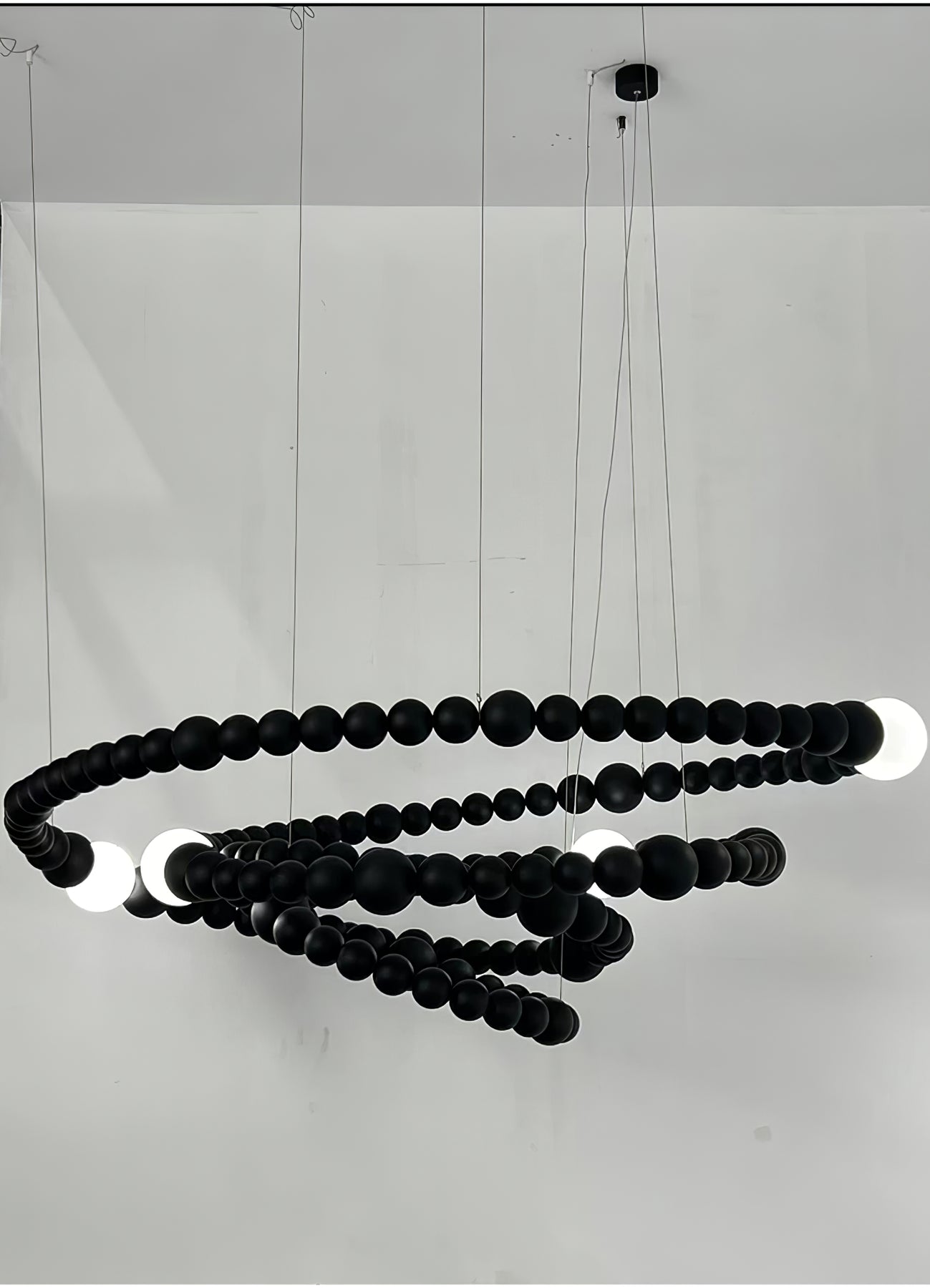 Sculptural. Sensational. Surreal. The Cosmic Beads Chandelier redefines lighting as an immersive installation. Draped in cascading strands of matte black spheres and glowing orbs, it conjures the illusion of floating pearls in orbit. This show-stopping fixture is both lighting and art — perfect for galleries, boutique hotels, or daring interiors.