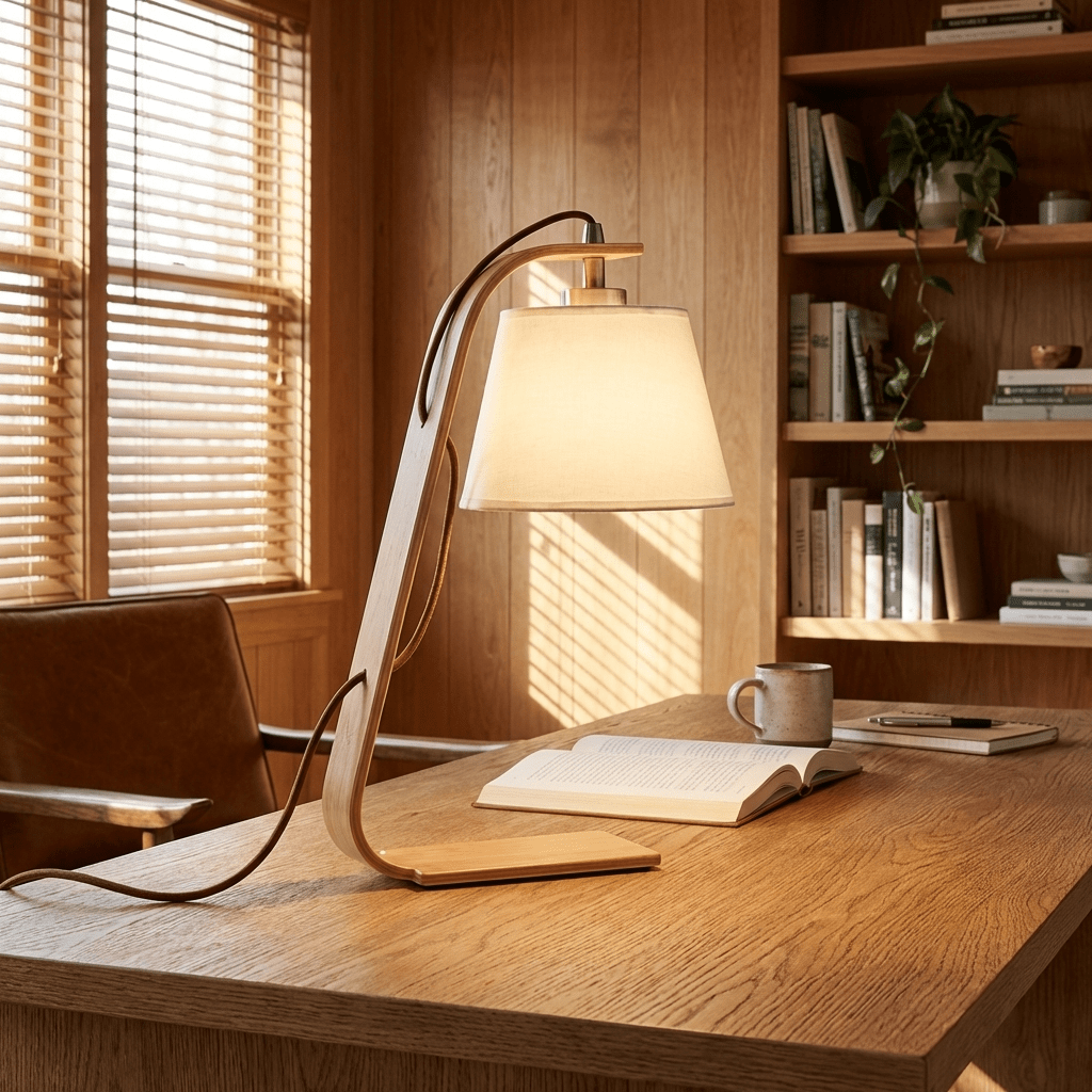 A graceful table lamp featuring a gently curved wooden frame that creates a flowing, sculptural silhouette. The warm natural wood contrasts beautifully with the crisp fabric shade, producing a soft and inviting glow. Its elegant bentwood-inspired form adds a sense of movement while maintaining a minimalist modern aesthetic. Designed by Vakkerlight, this lamp brings refined warmth and functional beauty to bedside tables, desks, or cozy reading corners.