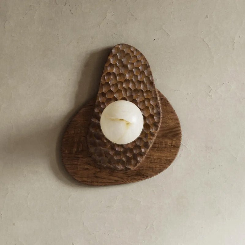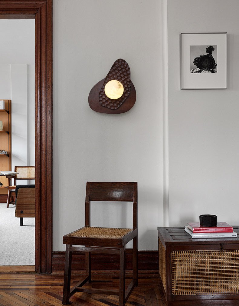 The Ember Nest Wall Light by Vakkerlight combines a warm glowing stone sphere with hand-textured metal and a sculptural wood backplate. Rich in material contrast and organic form, it creates a cozy, gallery-like focal point that feels both artisanal and modern.