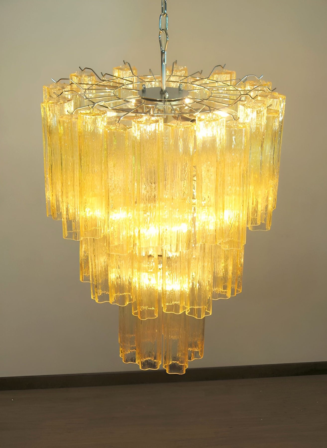 Illuminate your space with the vibrant charm of the Yellow Murano Glass Tube Chandelier. Crafted with exquisite Murano glass, this chandelier features a stunning array of elongated, handblown yellow glass tubes that create a captivating cascade of color and light. The warm, golden yellow hue brings an uplifting and welcoming atmosphere to any room, making it the perfect centerpiece for modern and classic interiors alike.