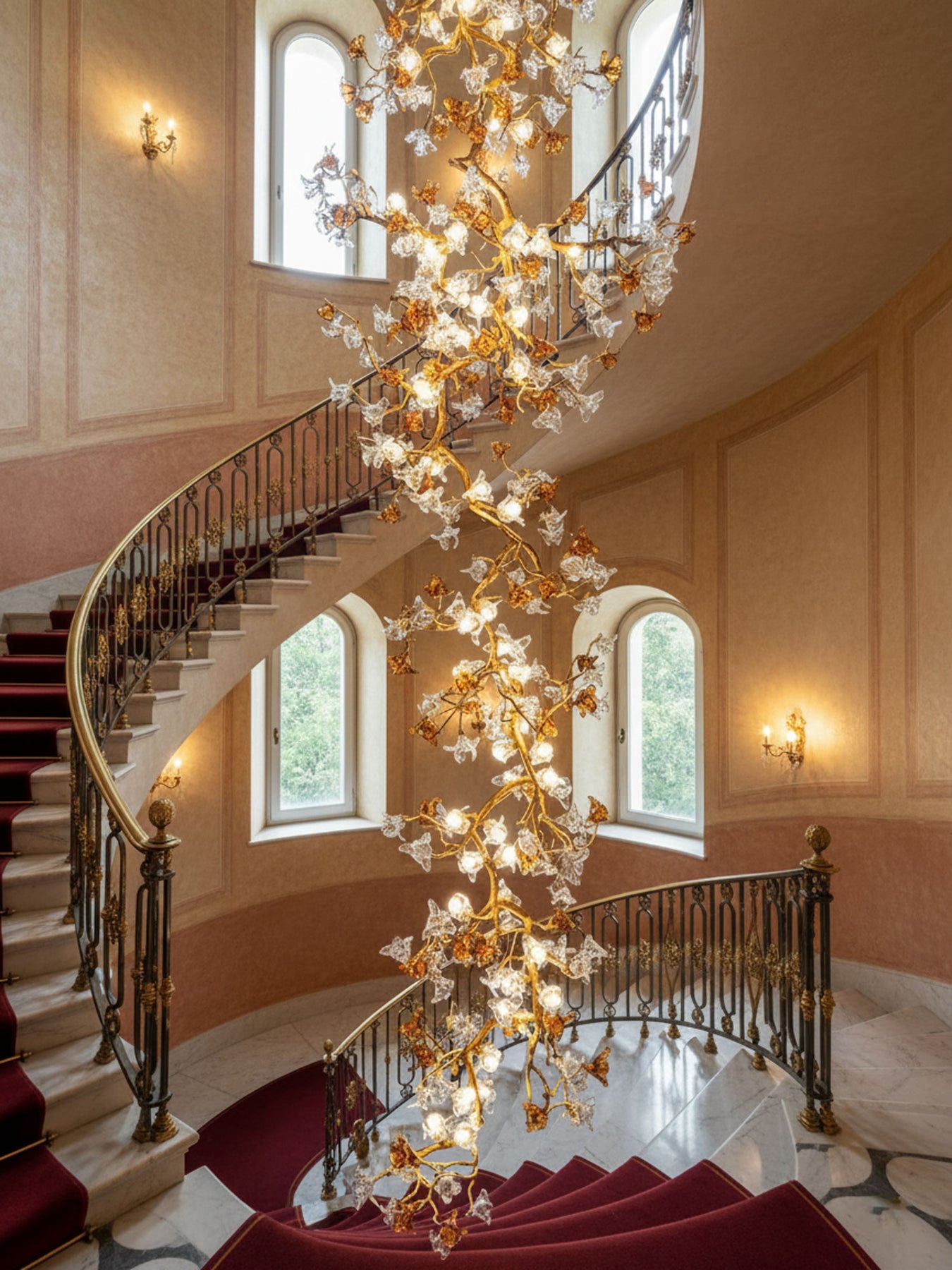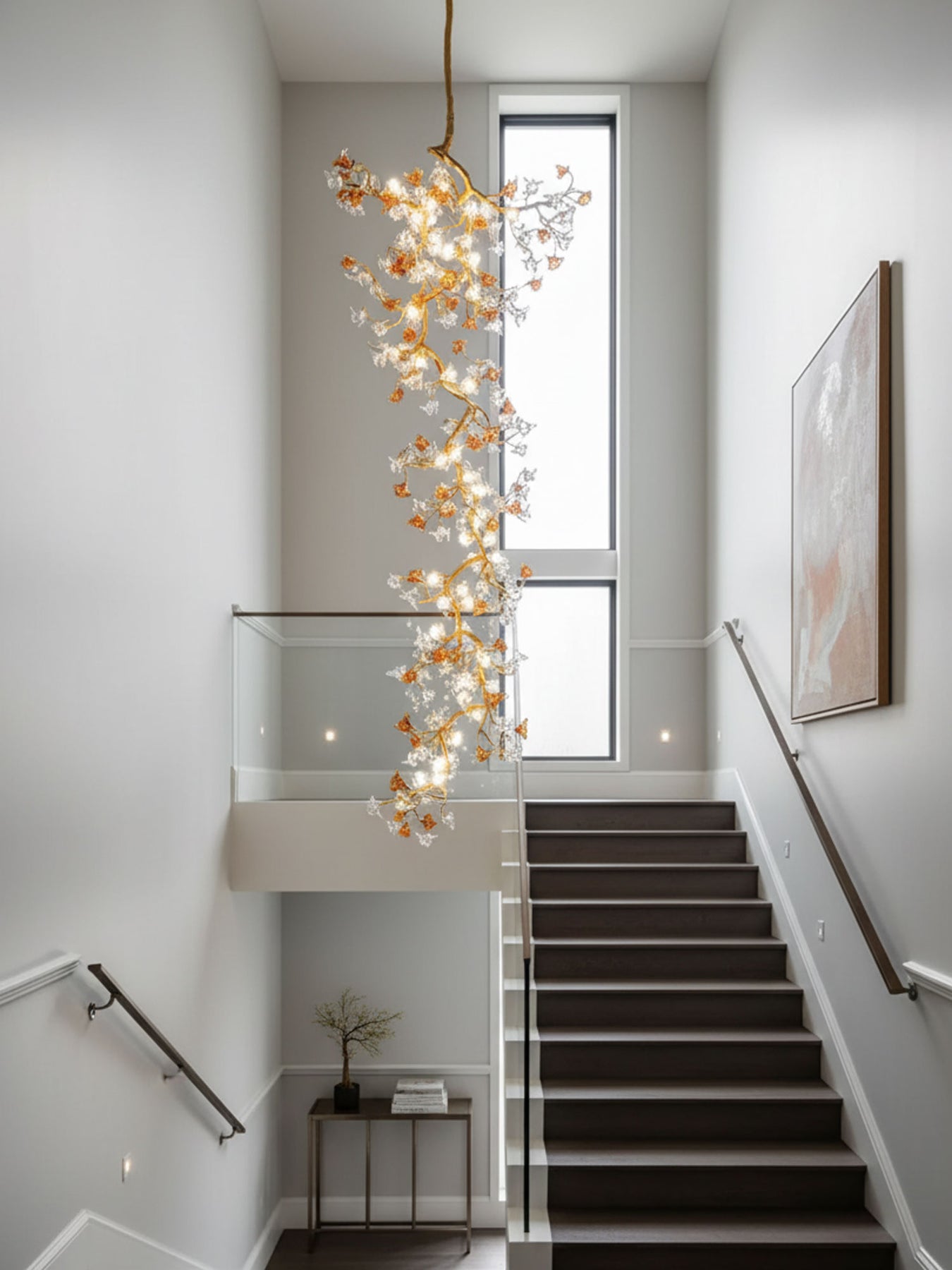 Enhance vertical spaces with cascading pendant arrangements that follow the natural rise of the staircase. The layered height and soft glow create a dramatic, sculptural presence from the first floor to the next.