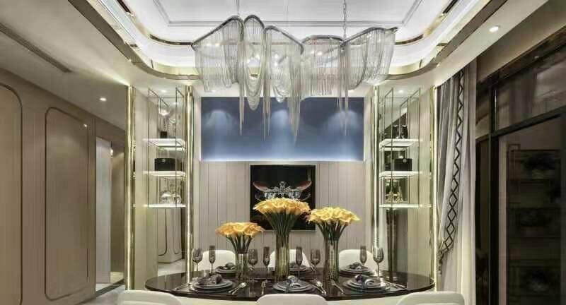 Elevate your space with the Ark Tassel Chandelier. This postmodern rectangular dining room chandelier boasts a durable iron and aluminum construction, with a high-quality tassel chain that is anti-oxidation treated for long-lasting beauty. Make a statement with this creative designer piece in your living room, bar, or dining area.