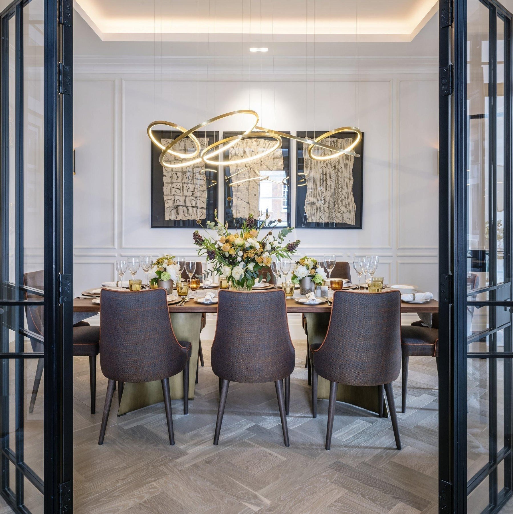 | غرفة الطعام | يجب أن يكون حجم التركيبات من 1/2 إلى 2/3 عرض طاولة الطعام. | الثريات، المصابيح المُعلقة الخطية، الشمعدانات الجدارية. | علّق الثريات أو المصابيح المُعلقة على ارتفاع 32-36 بوصة فوق سطح الطاولة. ضع في اعتبارك استخدام مصابيح مُعلقة متعددة للطاولات الأطول. |