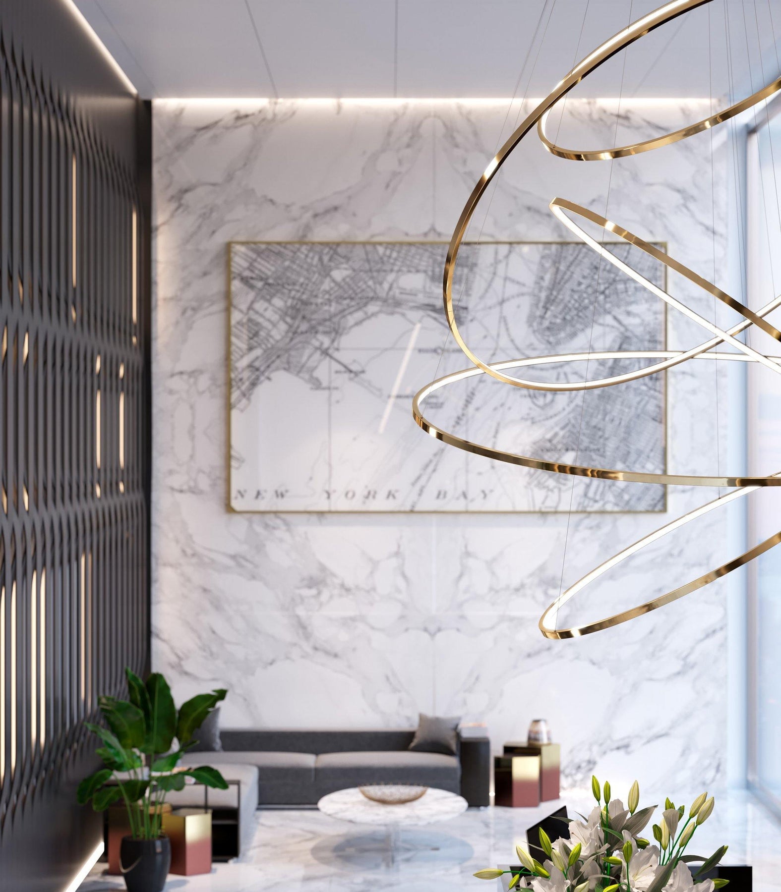 الثريات والمعلقات: تعتبر هذه القطع مركز الاهتمام في غرفة المعيشة، خاصةً في الغرف ذات الأسقف العالية. لضمان الحجم المناسب، استخدم صيغة أبعاد الغرفة وتأكد من أن حجم التركيب يتناسب مع تصميم الغرفة. القاعدة العامة هي التأكد من وجود مسافة ٧ أقدام على الأقل بين التركيب والأرضية.