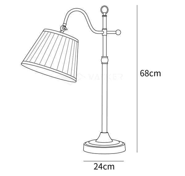 مصباح طاولة تقليدي بلمسة نهائية من النحاس العتيق، مكتمل بظل كريمي مطوي. الظل قابل للتعديل في الارتفاع ويمكن ضبطه بزاوية.