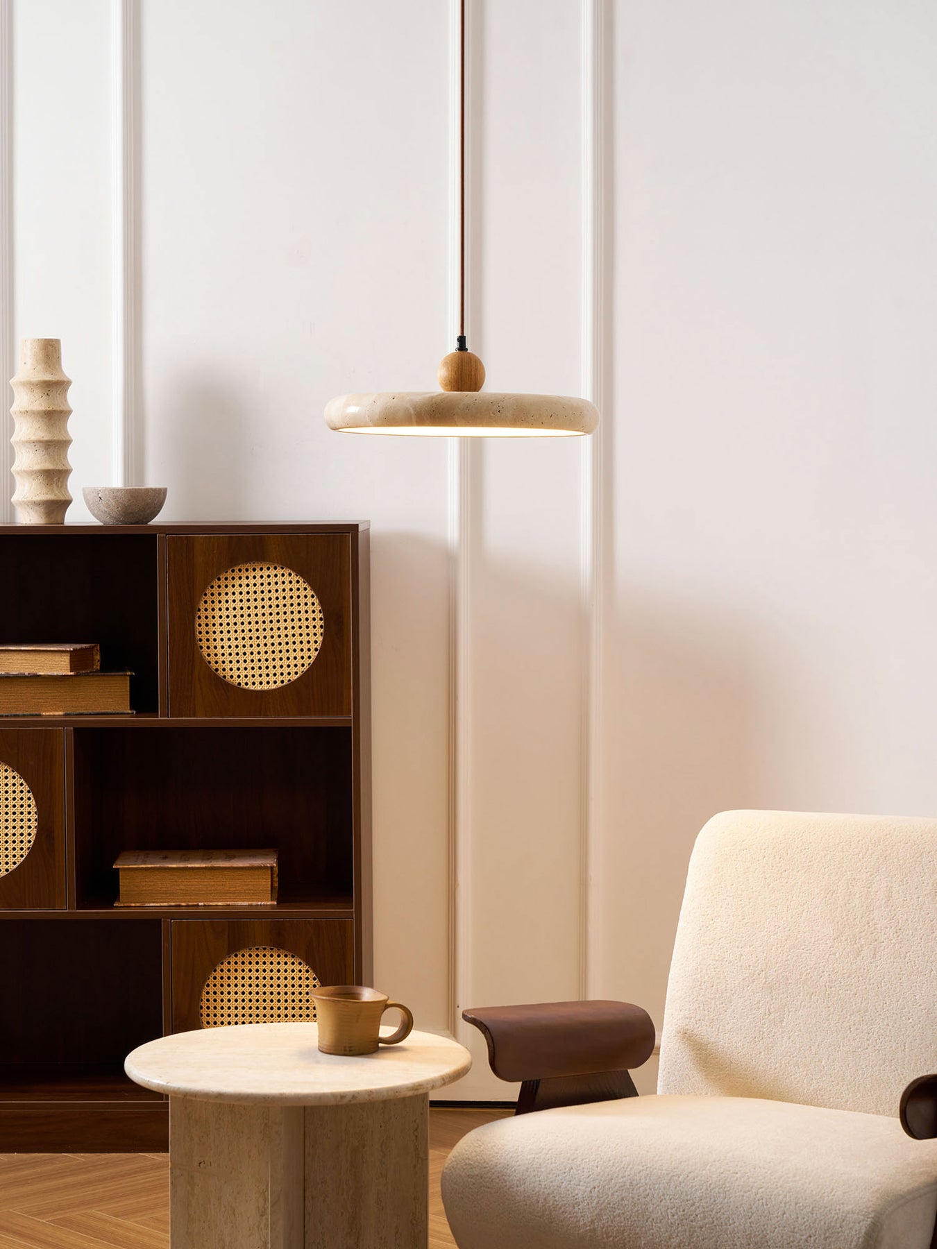 The Vakkerlight Lola Travertine Pendant Light is a blend of natural travertine and minimalist wooden elements, offering timeless elegance and a soft ambient glow that enhances any interior.