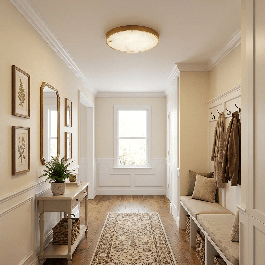 Hallway Lighting: Recessed or flush mount lights spaced evenly (every 8-10 feet) create a well-lit and inviting space.