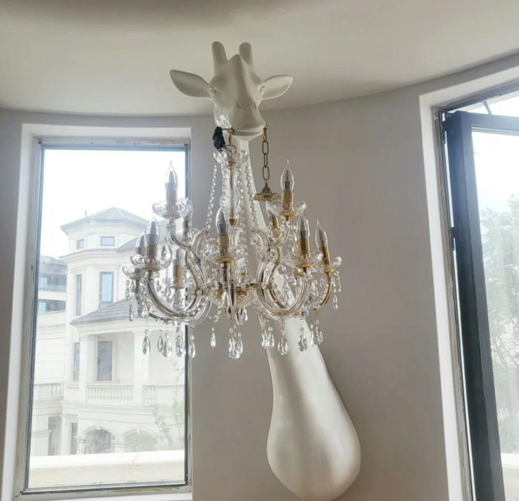 Introducing the Giraffe Royale Wall Lamp - a captivating blend of classic and modern design. This stunning lamp features a graceful giraffe gazing down upon a dazzling crystal chandelier, elevating your home decor to a new level of extraordinary art. Embrace the beauty and luxury of this unique piece.