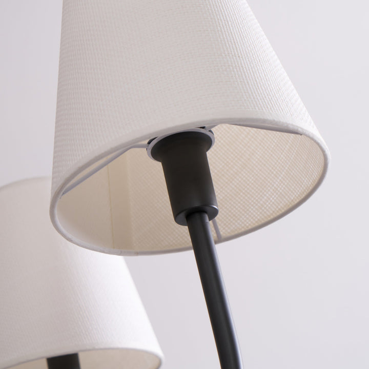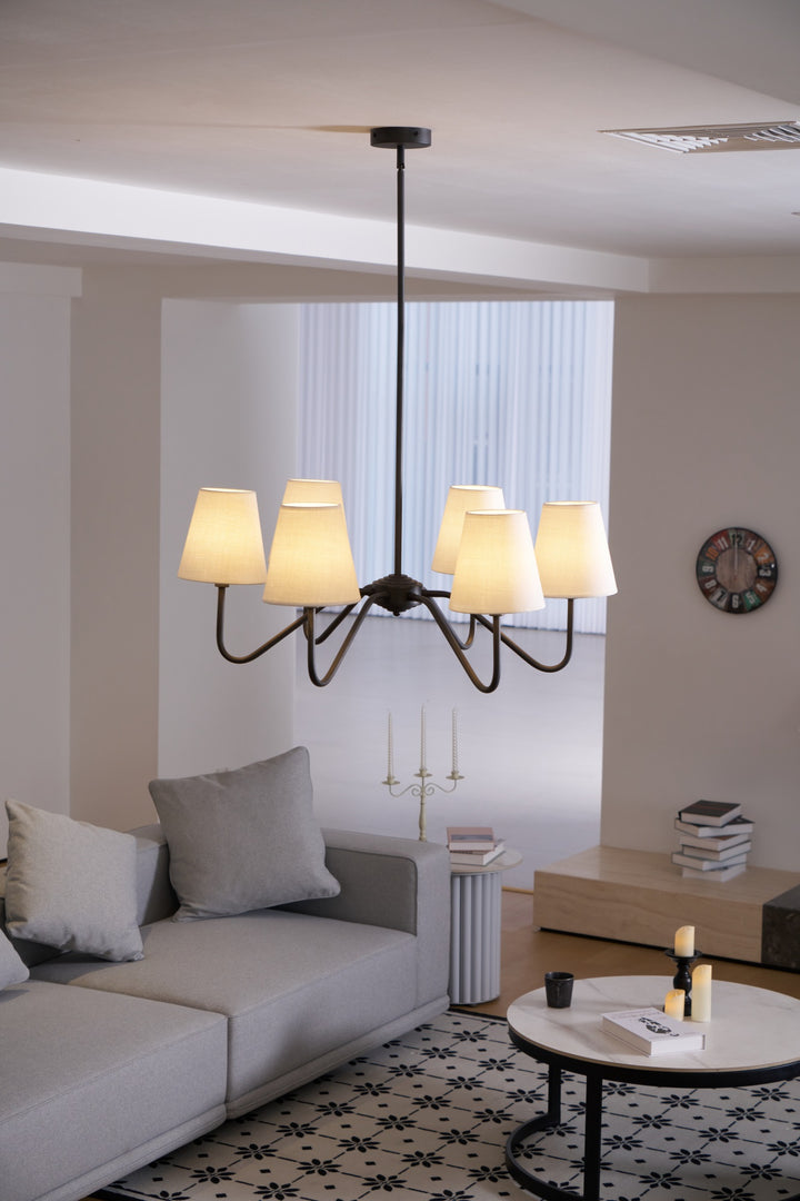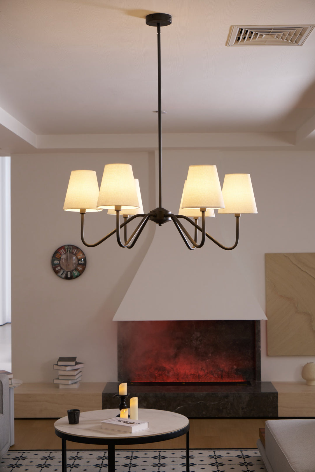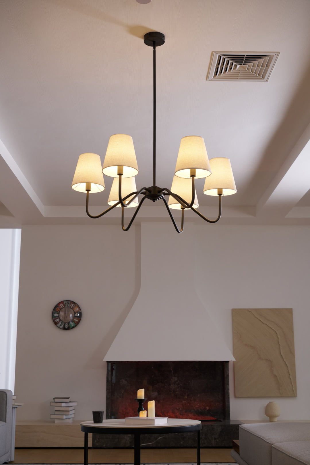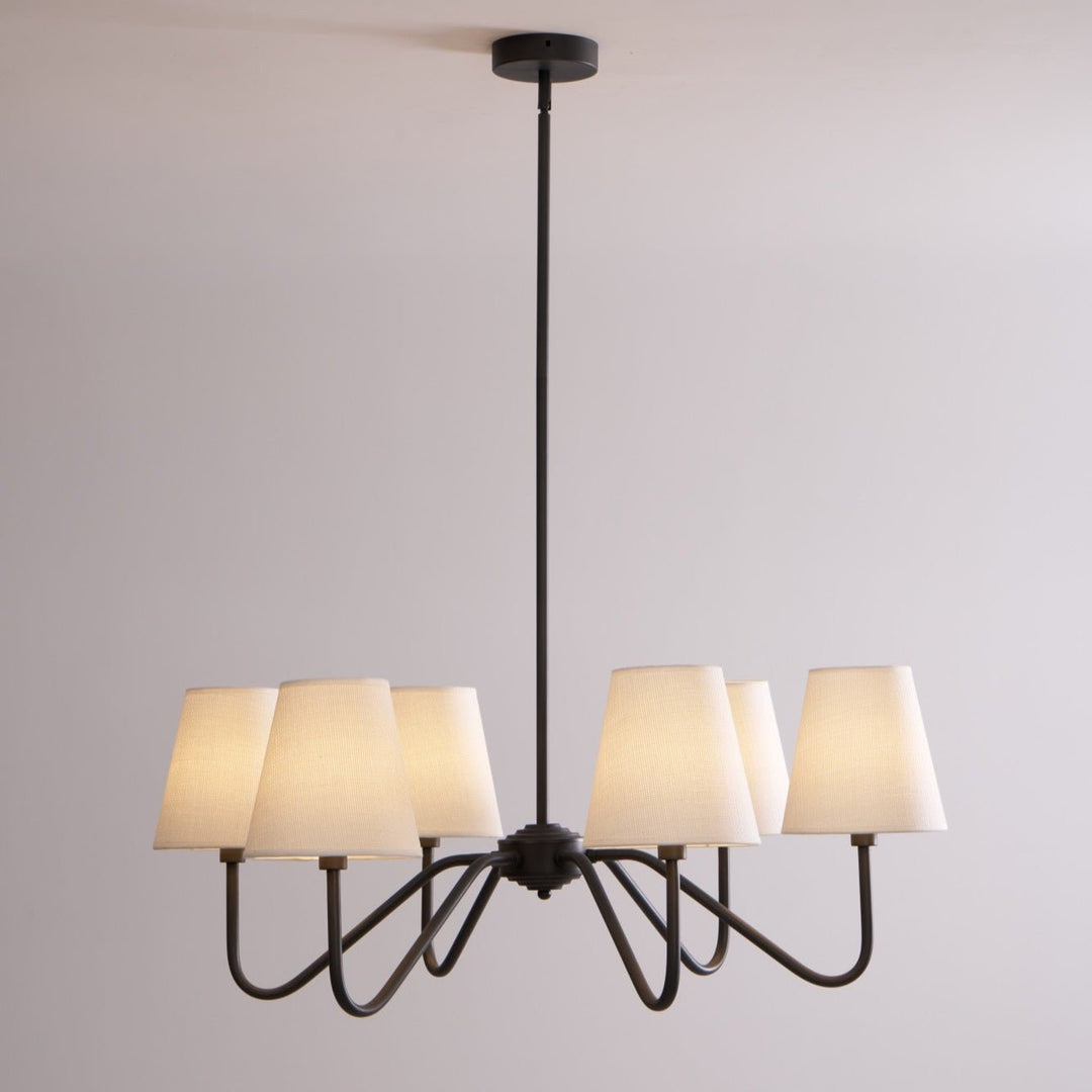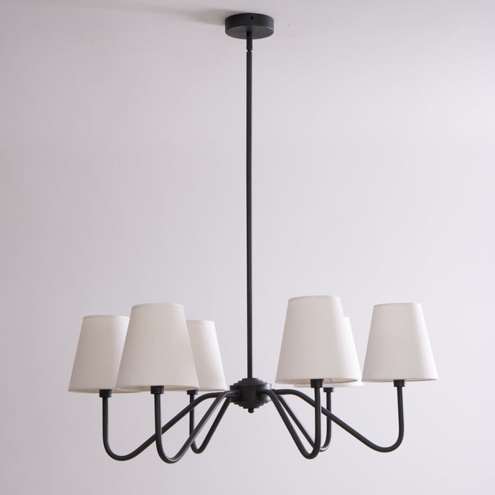 Introducing the Lumos Black Chandelier, a harmonious blend of modern elegance and minimalist design. This sleek chandelier features a striking black metal frame that radiates contemporary charm, paired with soft fabric lampshades to create a warm, inviting glow. The clean, curved lines of its arms contrast beautifully with the delicate texture of the shades, making this light fixture the perfect centerpiece for any living or dining room.