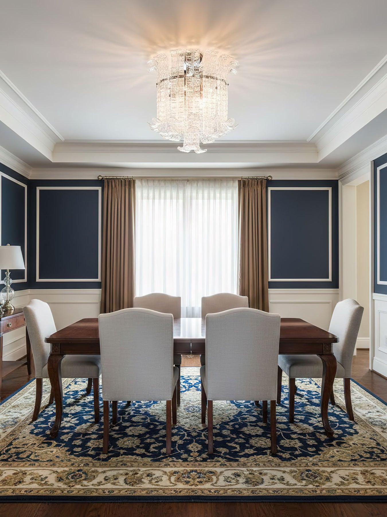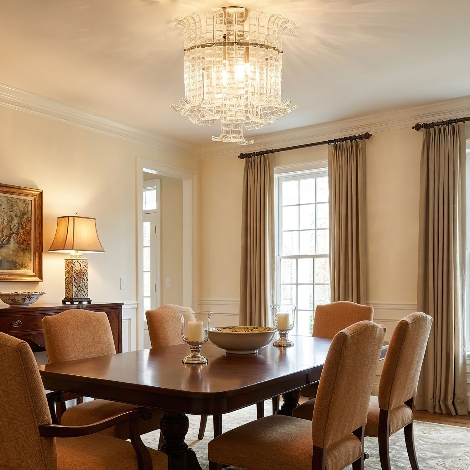- Chandeliers: As the centerpiece of the dining room, the chandelier should be wide enough to complement the size of the dining table but not so wide that it overwhelms the space. A diameter of 1/2 to 2/3 the table width is a good guide.