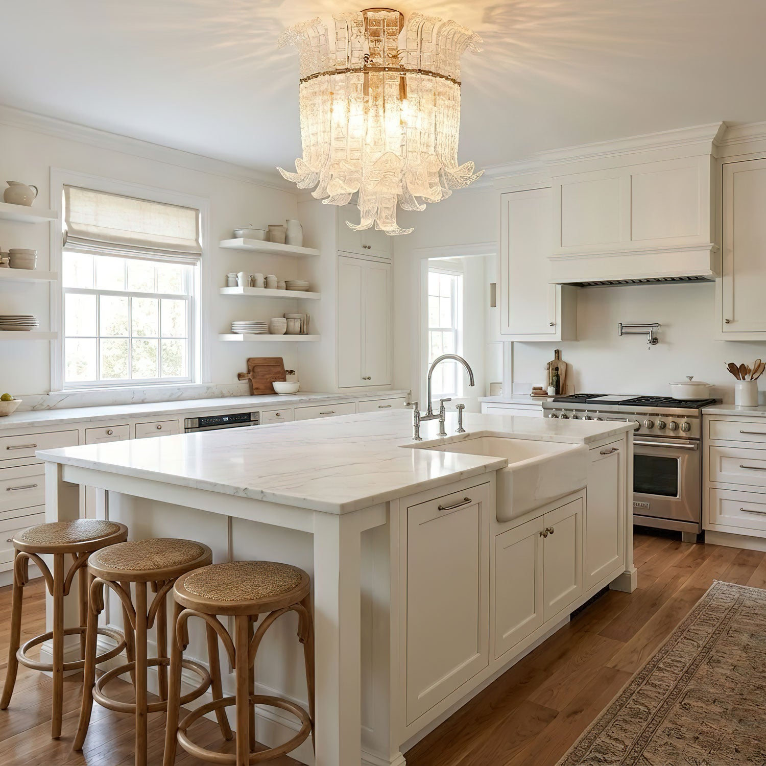 Pendants Over Island: These provide crucial task lighting for food prep and should hang 32-36 inches above the surface. Make sure that each pendant is about 1/4 the length of the island to provide sufficient coverage without overwhelming the space.