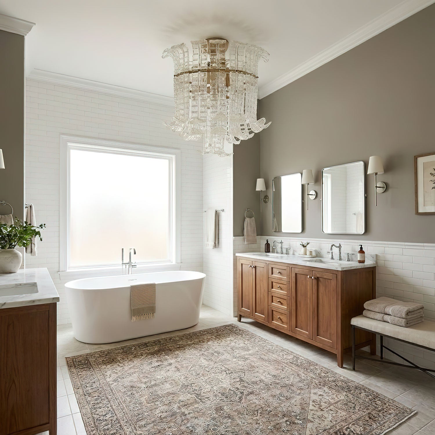 Chandeliers: The entryway is the perfect spot for a statement chandelier. Use the length + width formula to determine the diameter, and ensure the fixture hangs at least 7 feet from the floor to allow clearance.