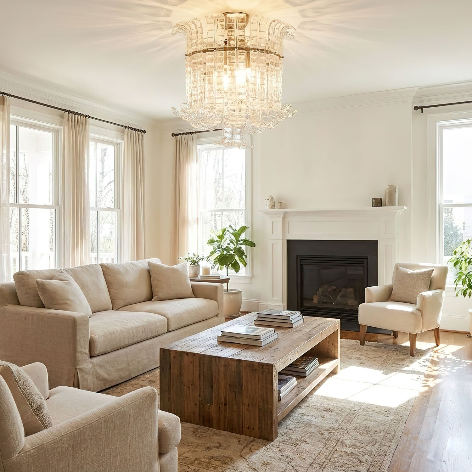 Chandeliers and Pendants: These are the focal points of the living room, especially in rooms with higher ceilings. To size appropriately, use the room dimension formula and ensure the fixture is in scale with the room’s layout. A general rule is to ensure there is at least 7 feet of clearance between the fixture and the floor.