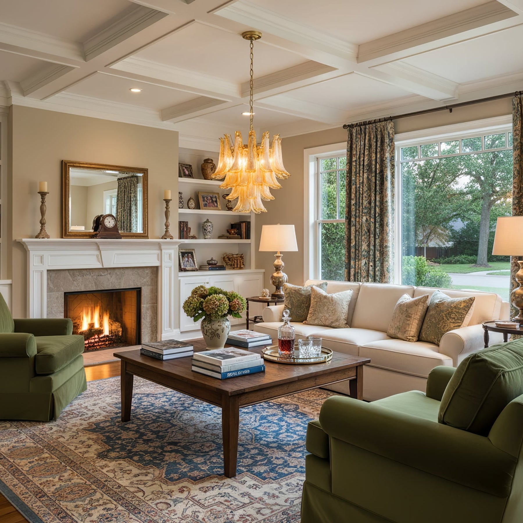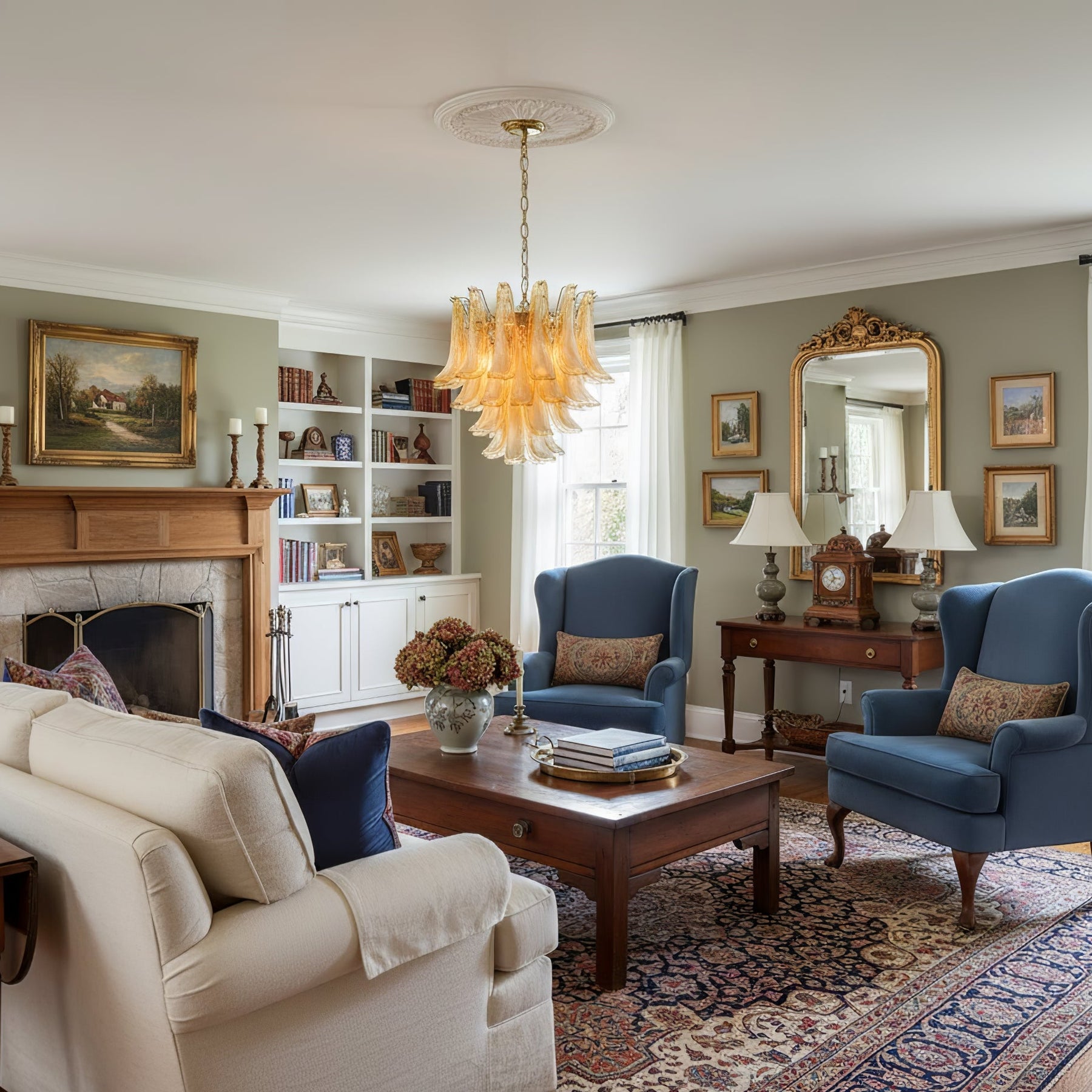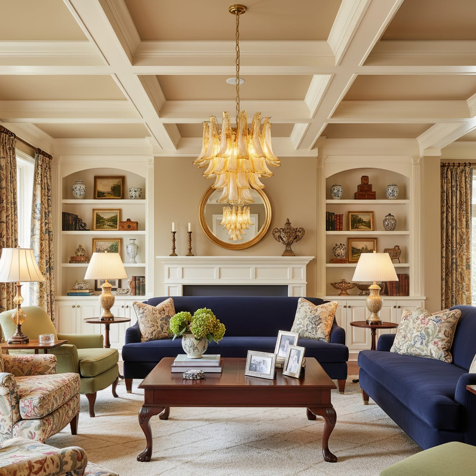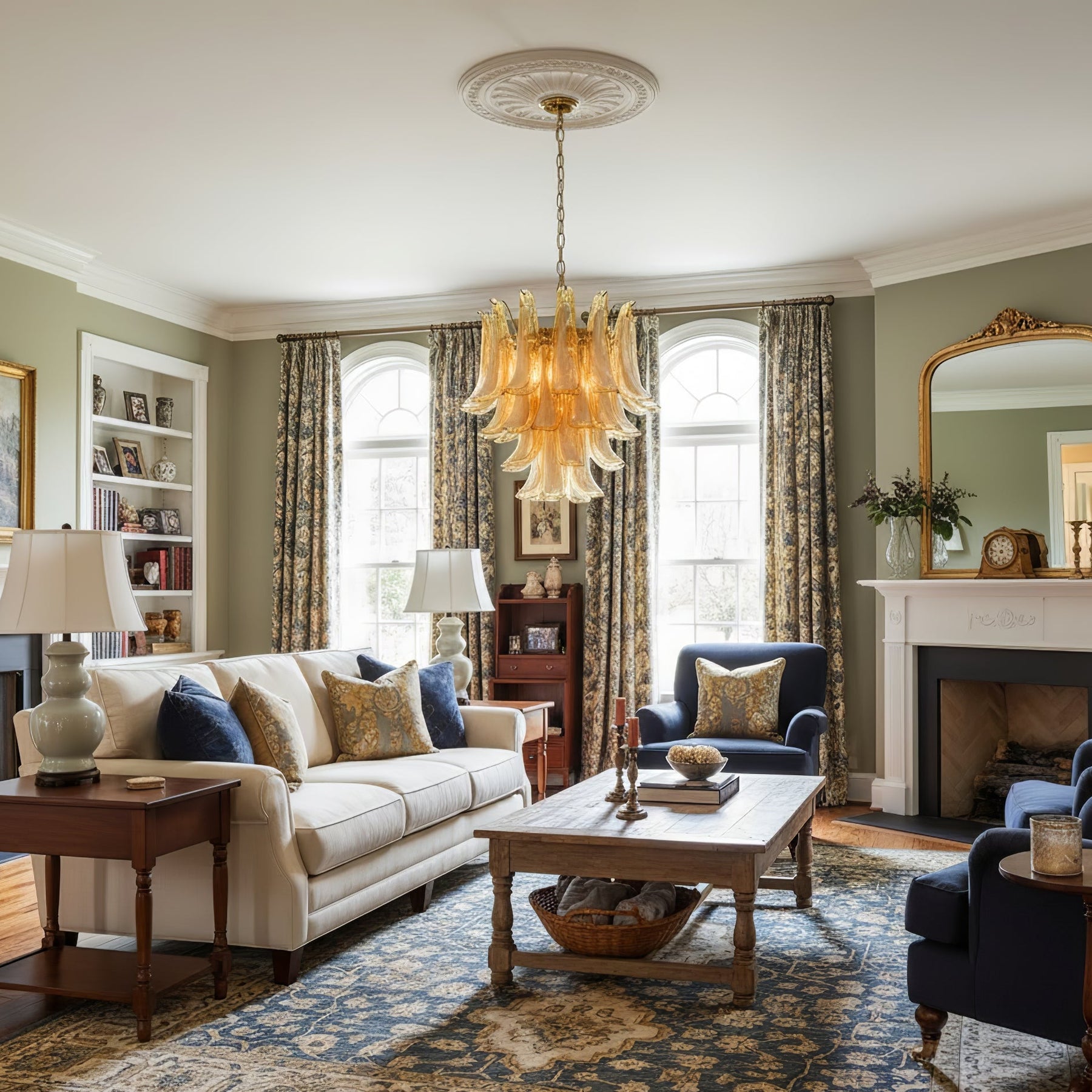 Chandeliers and Pendants: These are the focal points of the living room, especially in rooms with higher ceilings. To size appropriately, use the room dimension formula and ensure the fixture is in scale with the room’s layout. A general rule is to ensure there is at least 7 feet of clearance between the fixture and the floor.