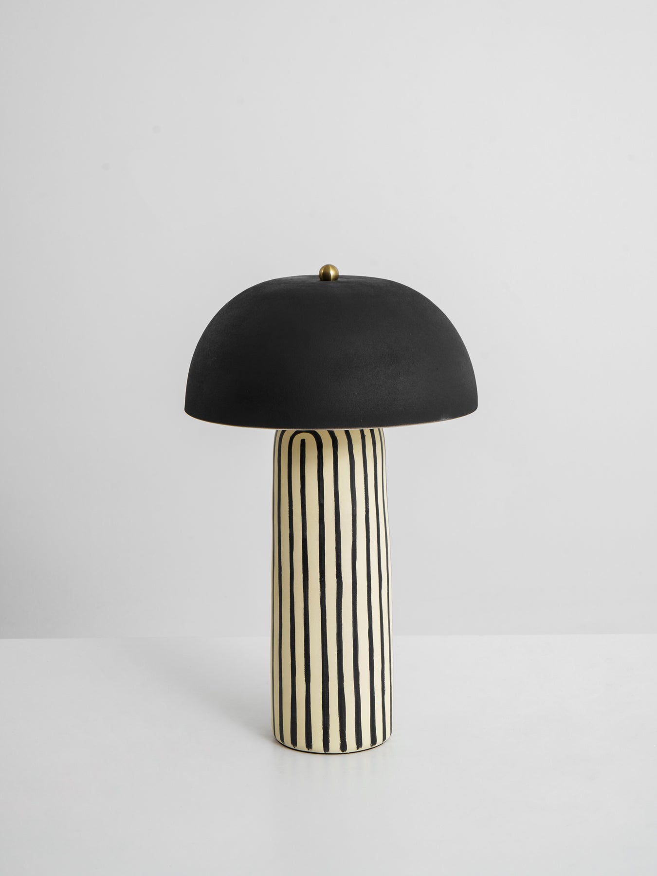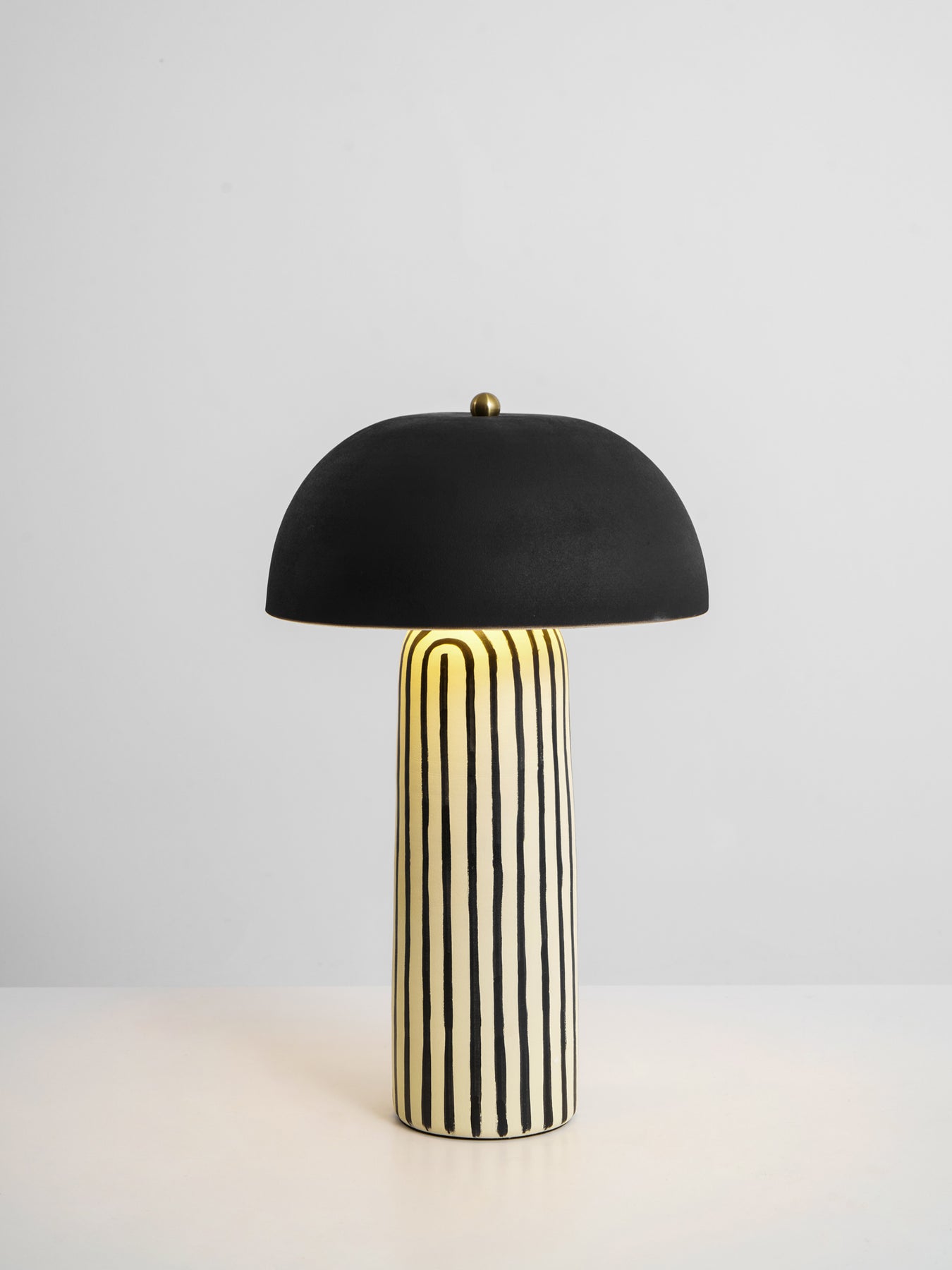 The Stria Table Lamp commands attention with its hand-painted black and white striped ceramic base, topped by a striking matte black dome shade. Playful yet sophisticated, this design adds a punch of modern artistry to living rooms, offices, or bedside tables — perfect for interiors that crave bold patterns and confident design.