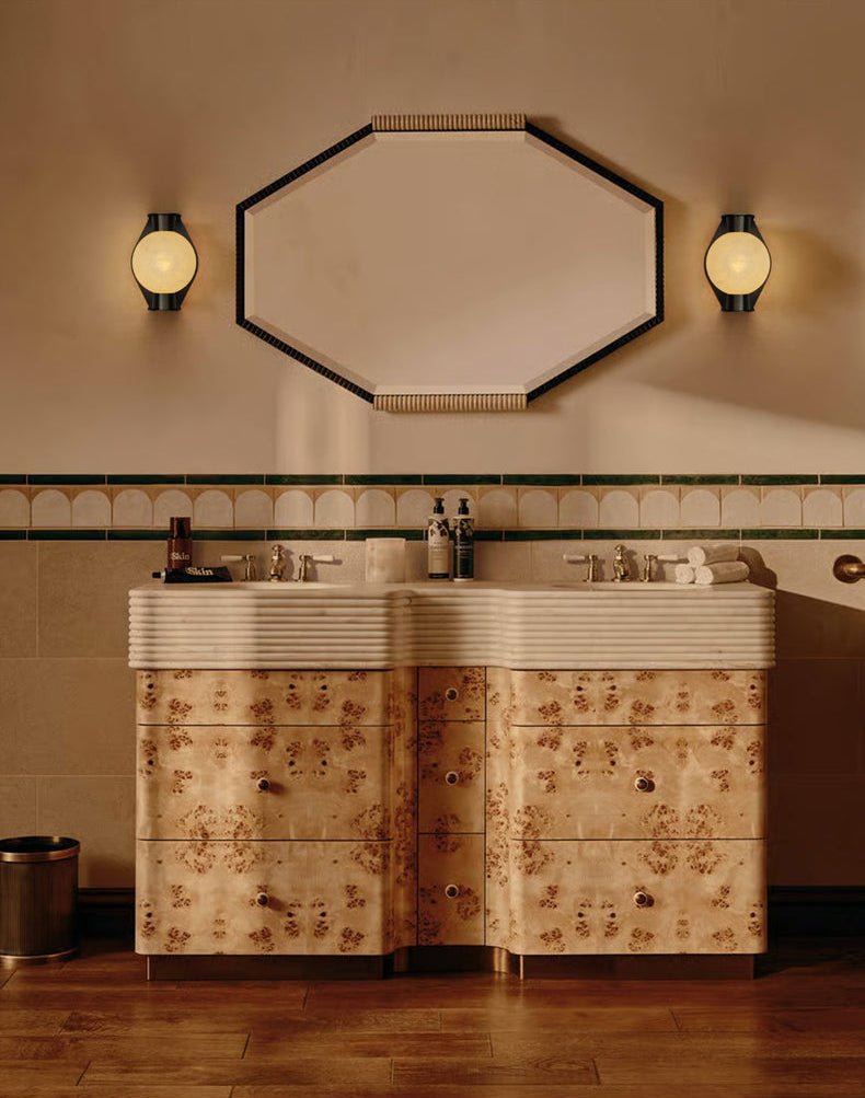 | Bathroom | Use the room dimension formula for general ceiling lights. | Vanity lights, sconces, flush mounts, recessed lights. | Sconces should be mounted 65-70 inches from the floor, and 24 inches above vanity mirrors for proper task lighting. |